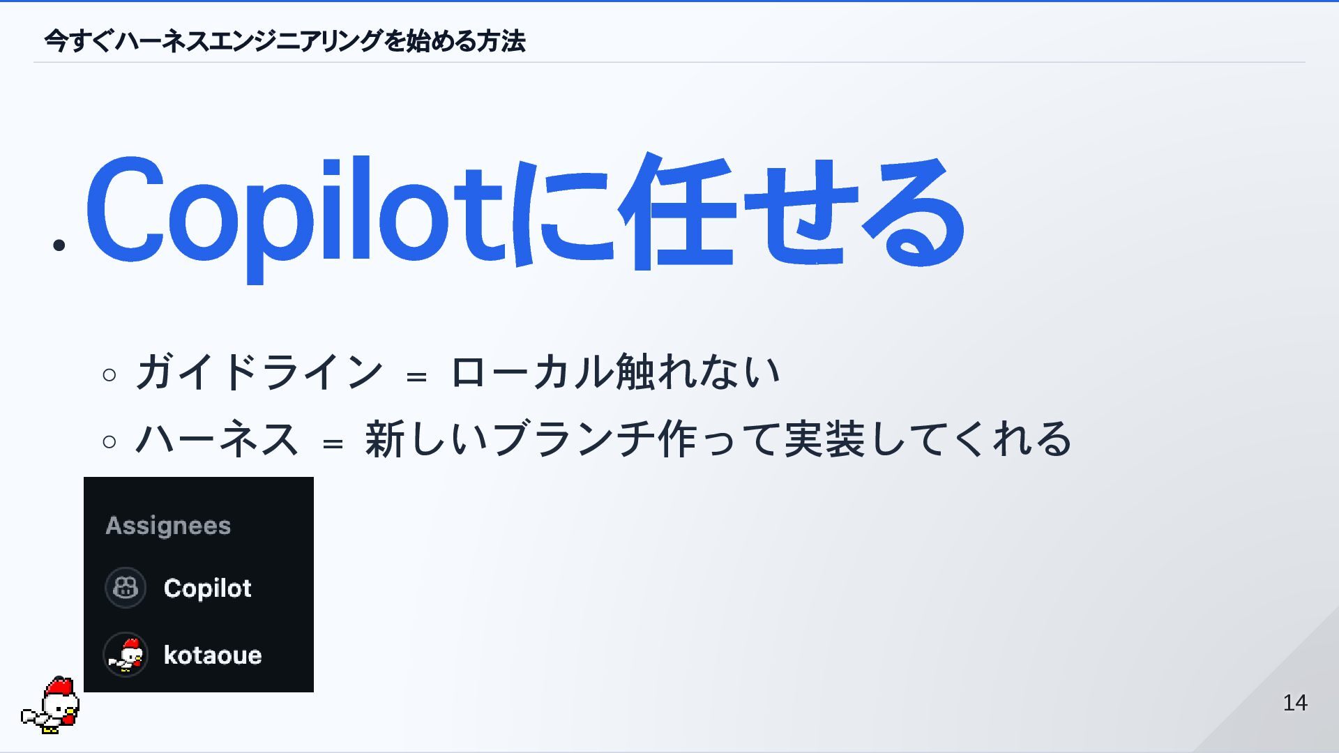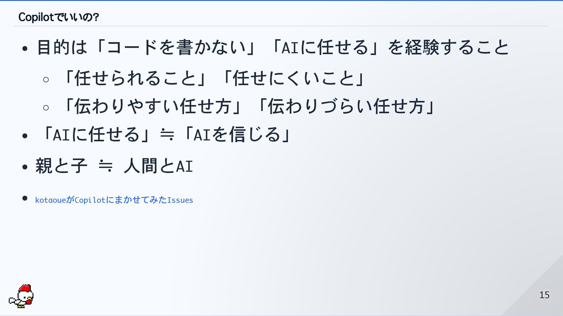 Copilotでいいの? 目的は「コードを書かない」「AIに任せる」を経験すること 「任せられること」「任せにくいこと」 「伝わりやすい任せ方」「伝わりづらい任せ方」 「AIに任せる」≒「AIを信じる」 親と子 ≒ 人間とAI kotaoueがCopilotにまかせてみたIssues 15