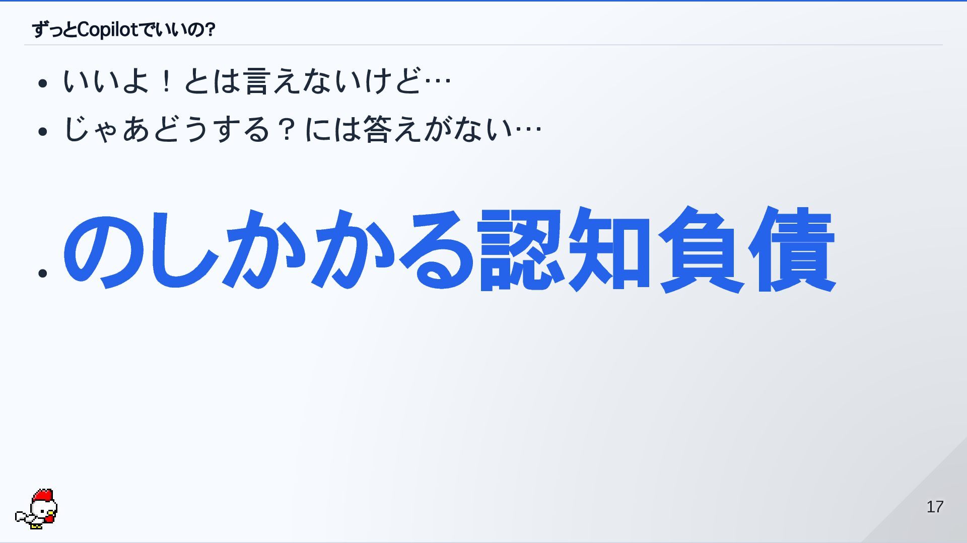 ずっとCopilotでいいの? いいよ!とは言えないけど… じゃあどうする?には答えがない… のしかかる認知負債 17 17