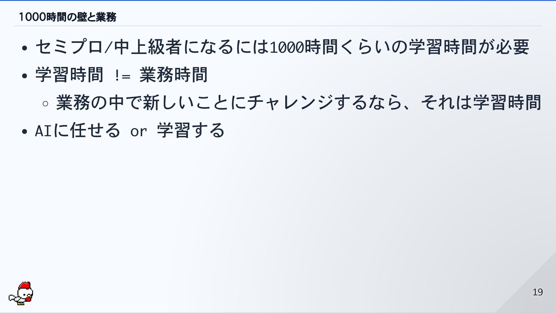 1000時間の壁と業務 セミプロ/中上級者になるには1000時間くらいの学習時間が必要 学習時間 != 業務時間 業務の中で新しいことにチャレンジするなら、それは学習時間 AIに任せる or 学習する 19