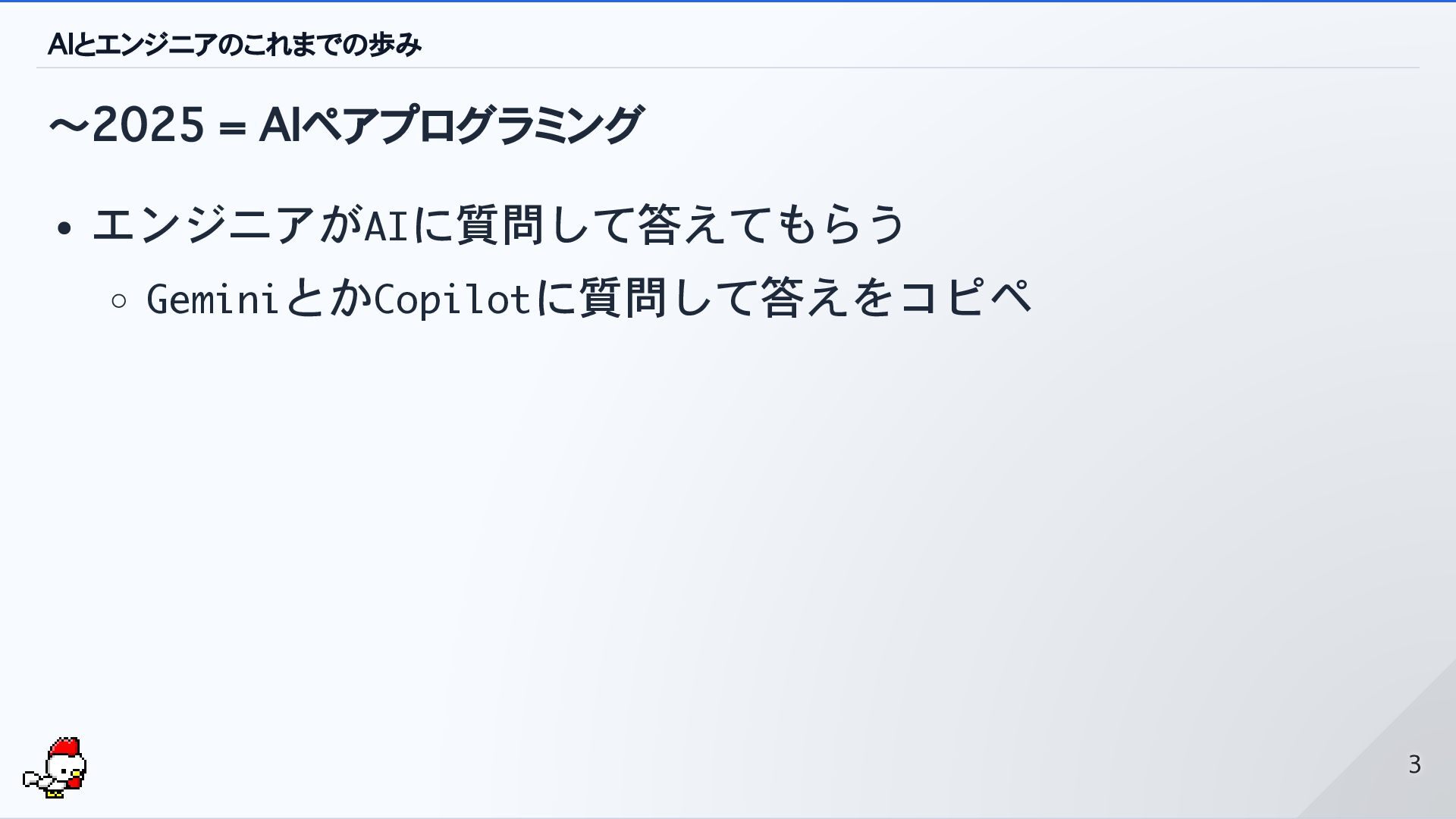 AIとエンジニアのこれまでの歩み 〜2025 = AIペアプログラミング エンジニアがAIに質問して答えてもらう GeminiとかCopilotに質問して答えをコピペ 3 3
