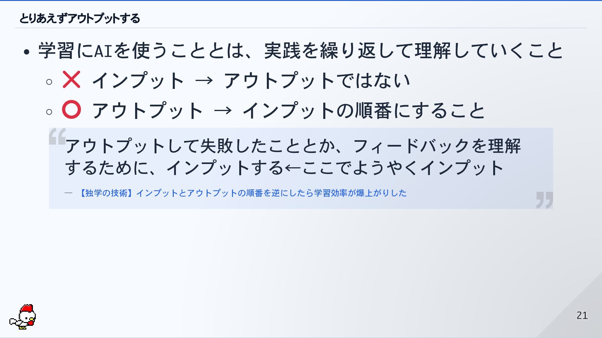 とりあえずアウトプットする 学習にAIを使うこととは、実践を繰り返して理解していくこと ️ インプット → アウトプットではない アウトプット → インプットの順番にすること アウトプットして失敗したこととか、フィードバックを理解
