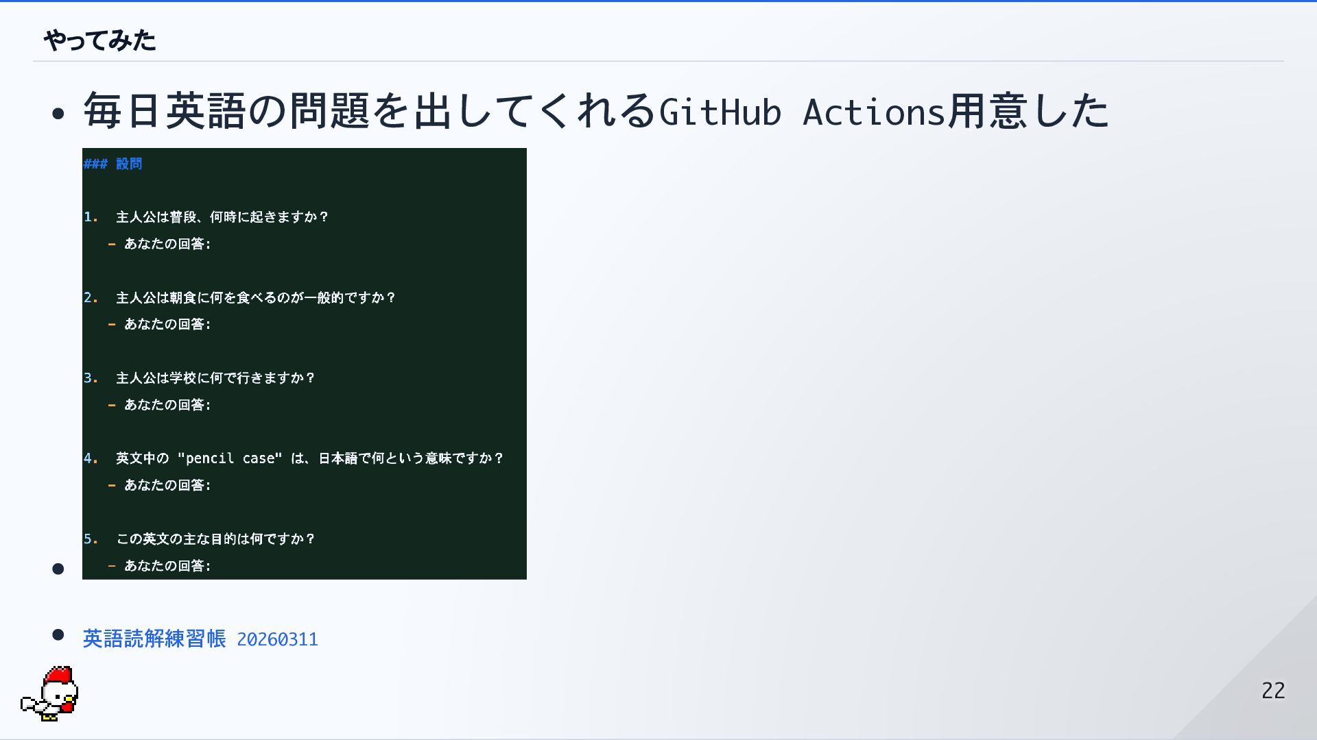 やってみた 毎日英語の問題を出してくれるGitHub Actions用意した 英語読解練習帳 20260311 22 22