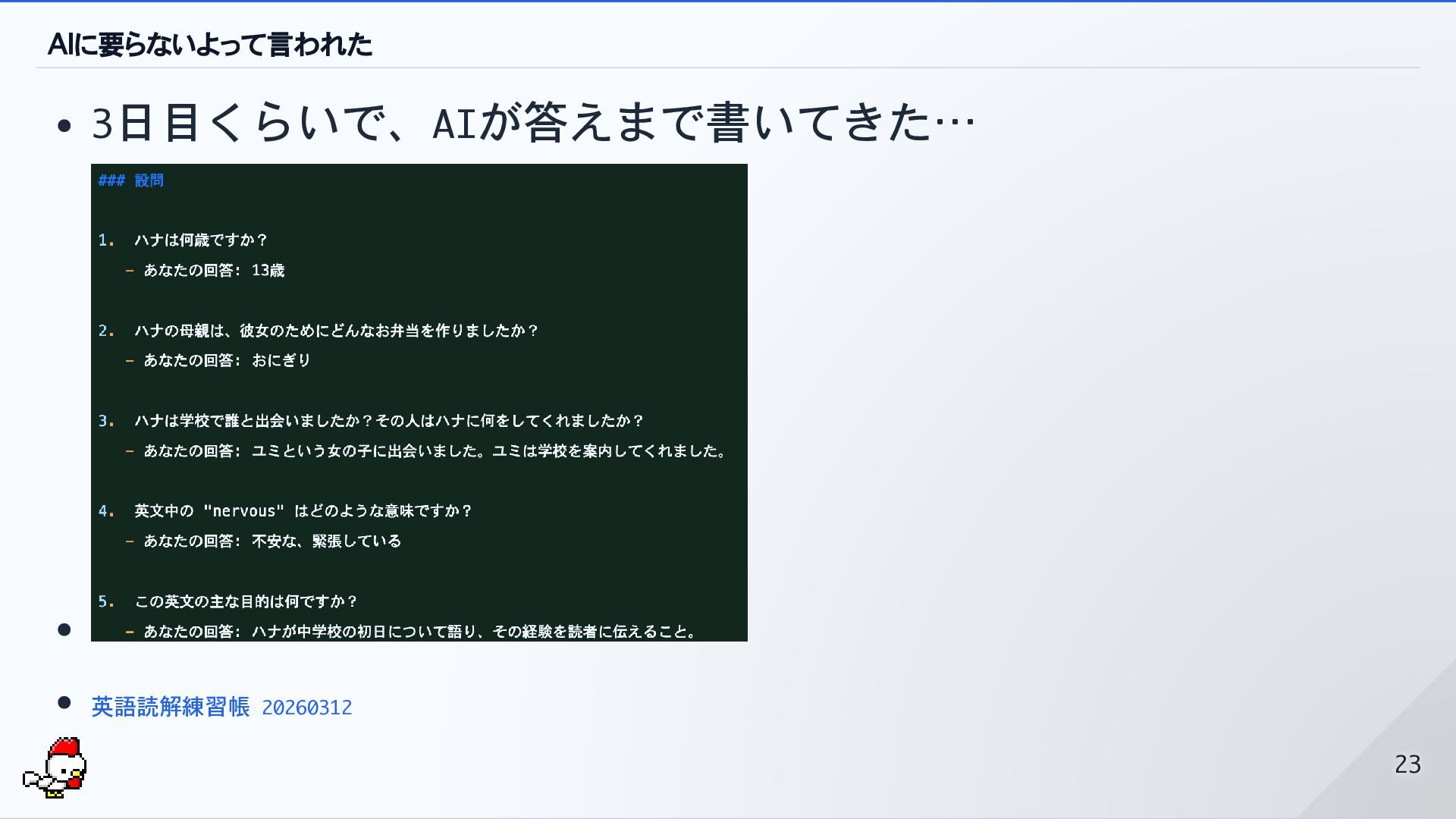 AIに要らないよって言われた 3日目くらいで、AIが答えまで書いてきた… 英語読解練習帳 20260312 23 23