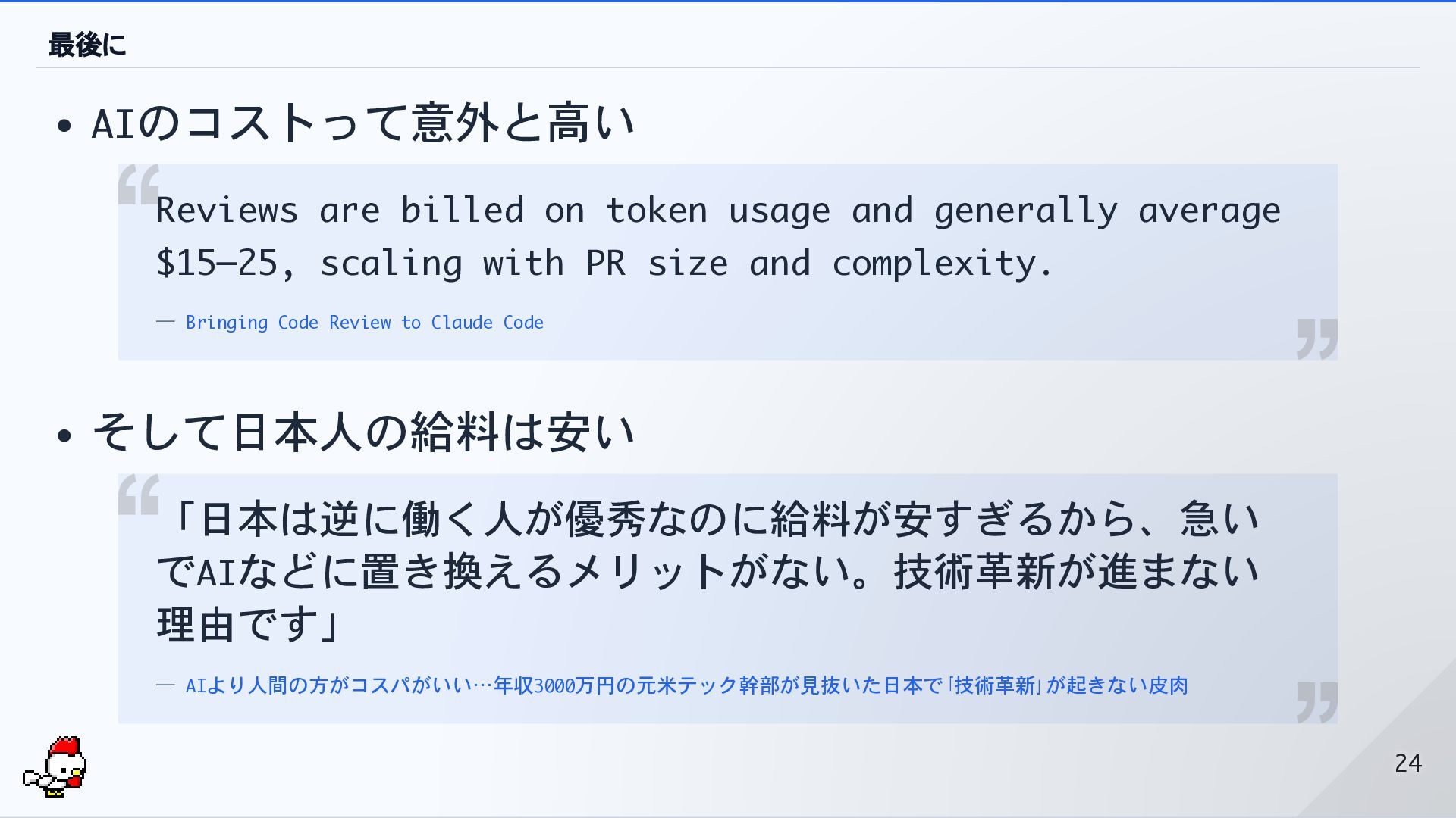 generally average $15 –25, scaling with PR size and complexity. — Bringing Code Review to Claude Code 「日本は逆に働く人が優秀なのに給料が安すぎるから、急い でAIなどに置き換えるメリットがない。技術革新が進まない 理由です」 — AIより人間の方がコスパがいい…年収3000万円の元米テック幹部が見抜いた日本で「技術革新」が起きない皮肉 24 24
