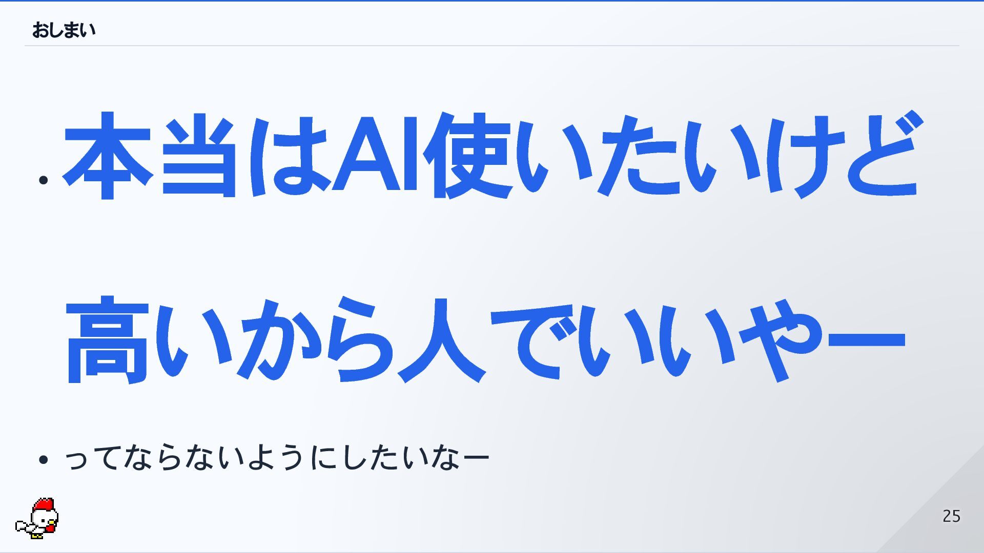 おしまい 本当はAI使いたいけど 高いから人でいいやー ってならないようにしたいなー 25 25