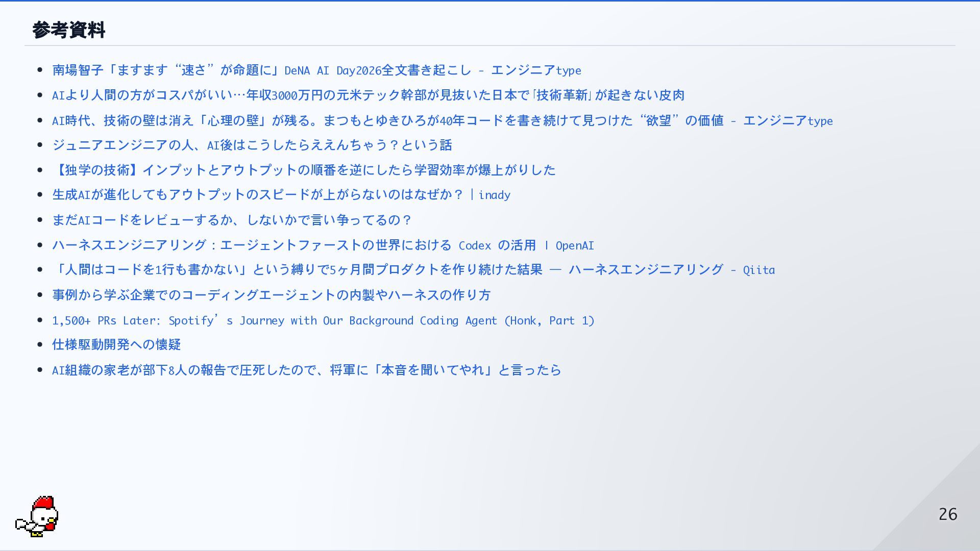 参考資料 南場智子「ますます“速さ”が命題に」DeNA AI Day2026全文書き起こし - エンジニアtype AIより人間の方がコスパがいい…年収3000万円の元米テック幹部が見抜いた日本で「技術革新」が起きない皮肉 AI時代、技術の壁は消え「心理の壁」が残る。まつもとゆきひろが40年コードを書き続けて見つけた“欲望”の価値 - エンジニアtype