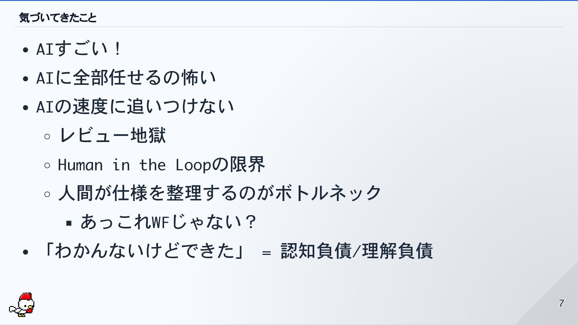 気づいてきたこと AIすごい! AIに全部任せるの怖い AIの速度に追いつけない レビュー地獄 Human in the Loopの限界 人間が仕様を整理するのがボトルネック