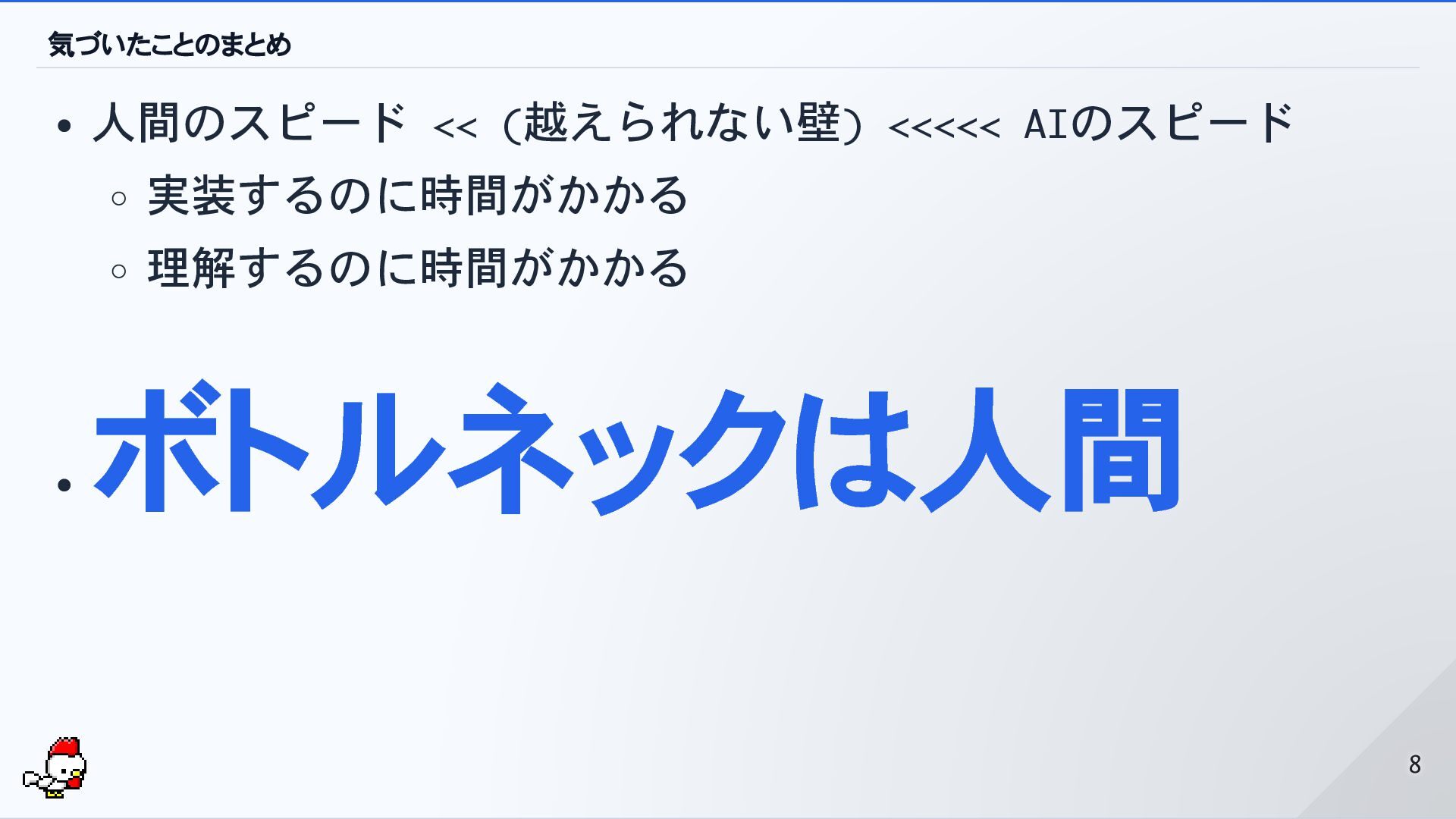 気づいたことのまとめ 人間のスピード << (越えられない壁) <<<<< AIのスピード 実装するのに時間がかかる 理解するのに時間がかかる ボトルネックは人間 8