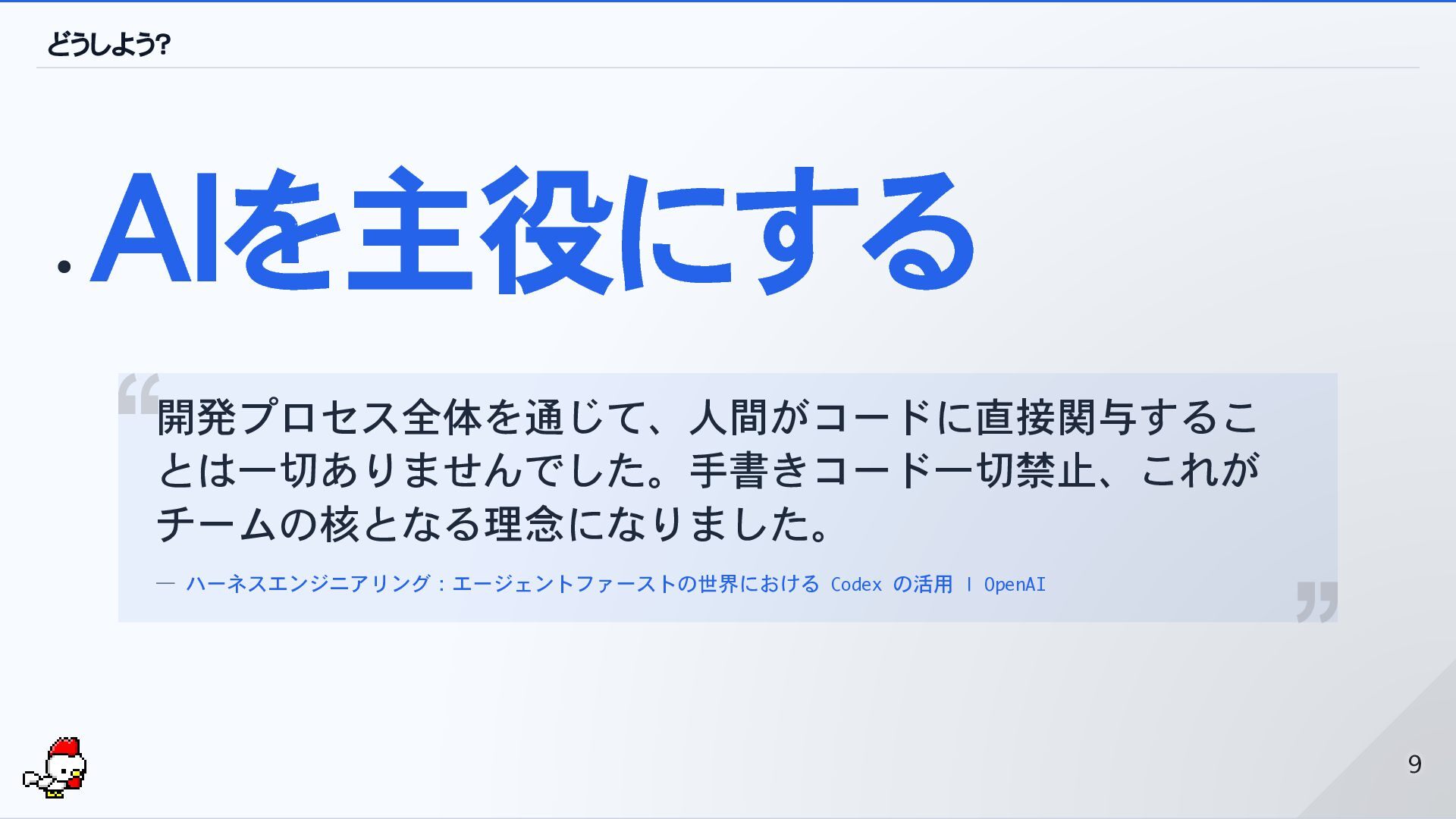 どうしよう? AIを主役にする 開発プロセス全体を通じて、人間がコードに直接関与するこ とは一切ありませんでした。手書きコード一切禁止、これが チームの核となる理念になりました。 — ハーネスエンジニアリング:エージェントファーストの世界における Codex の活用 |