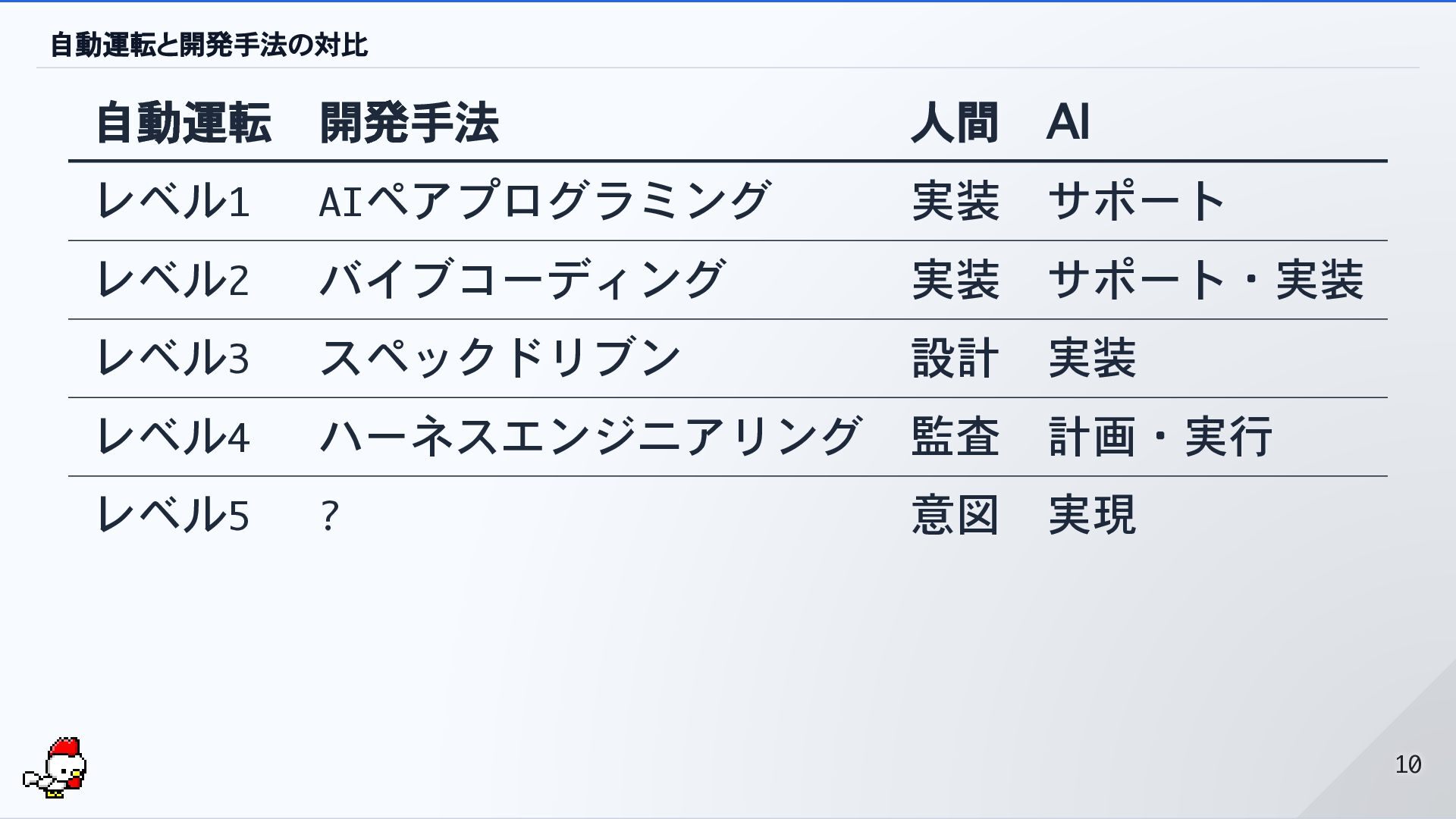 バイブコーディング 実装 サポート・実装 レベル3 スペックドリブン 設計 実装 レベル4 ハーネスエンジニアリング 監査 計画・実行 レベル5 ? 意図 実現 10 10