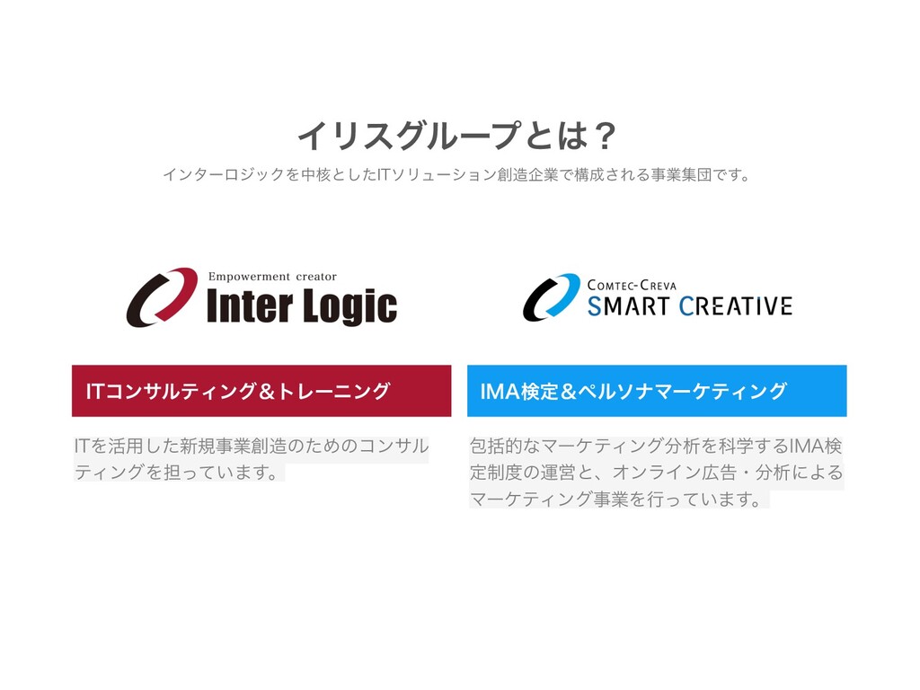 ΠϦεάϧʔϓͱʁ ΠϯλʔϩδοΫΛத֩ͱͨ͠*5ιϦϡʔγϣϯاۀͰߏ͞ΕΔࣄۀूஂͰ͢ɻ *5Λ׆༻ͨ͠৽نࣄۀͷͨΊͷίϯαϧ ςΟϯάΛ୲͍ͬͯ·͢ɻ *5ίϯαϧςΟϯάˍτϨʔχϯά *."ݕఆˍϖϧιφϚʔέςΟϯά แׅతͳϚʔέςΟϯάੳΛՊֶ͢Δ*."ݕ ఆ੍ͷӡӦͱɺΦϯϥΠϯࠂɾੳʹΑΔ ϚʔέςΟϯάࣄۀΛߦ͍ͬͯ·͢ɻ