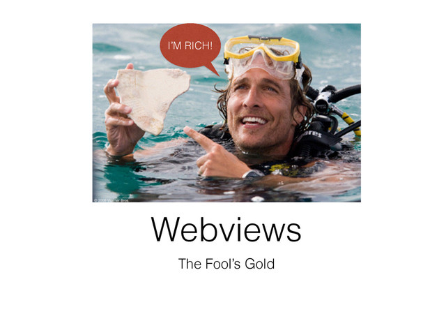 files. Make sure they’re lean. • Optimize all your images. Consider using texture sheets to improve performance. • Consider the offline situation. • AppCache can be a douchbag but you still might consider • You assume responsibility for the ENTIRE UI experience. • Test how much data you’re bring down on average. • Test with VoiceOver. • Consider using a framework like Phonegap which are optimized to work in a web view and have tons of plug-ins and support.