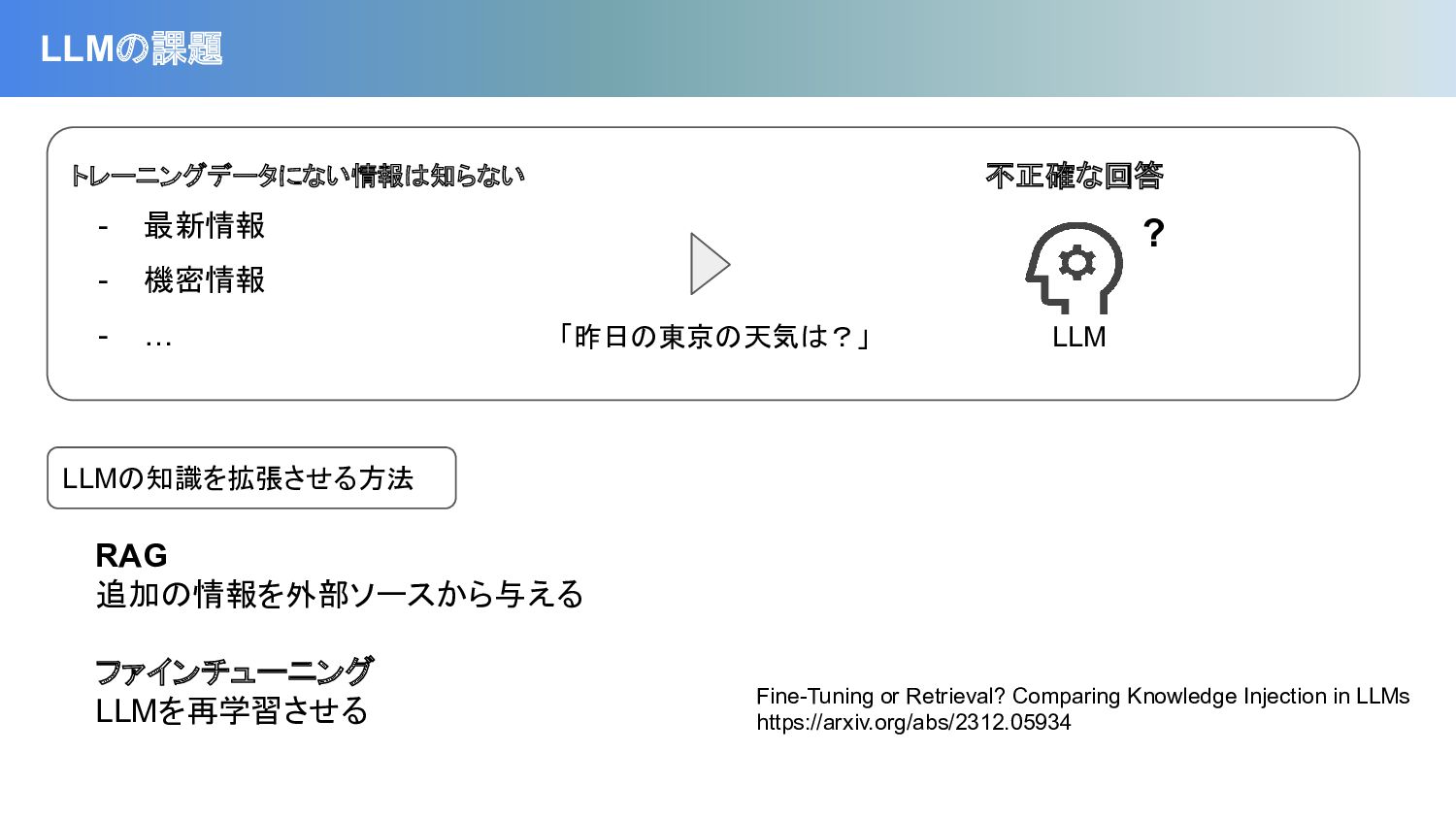 不正確な回答 トレーニングデータにない情報は知らない - 最新情報 - 機密情報 - … LLM ? RAG 追加の情報を外部ソースから与える ファインチューニング LLMを再学習させる LLMの知識を拡張させる方法 「昨日の東京の天気は?」