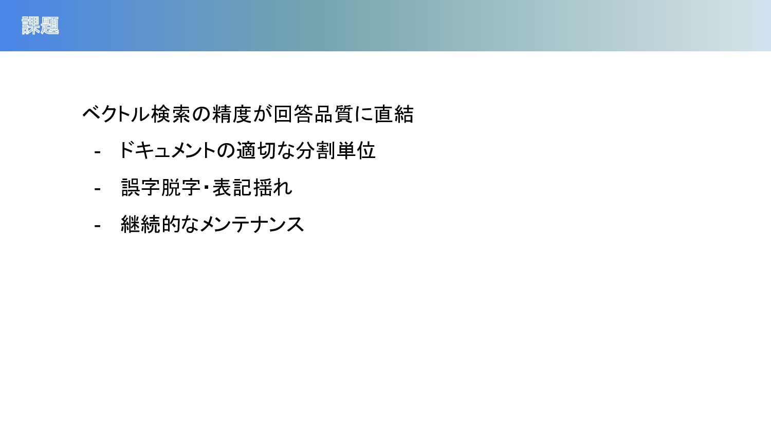 課題 ベクトル検索の精度が回答品質に直結 - ドキュメントの適切な分割単位 - 誤字脱字・表記揺れ - 継続的なメンテナンス