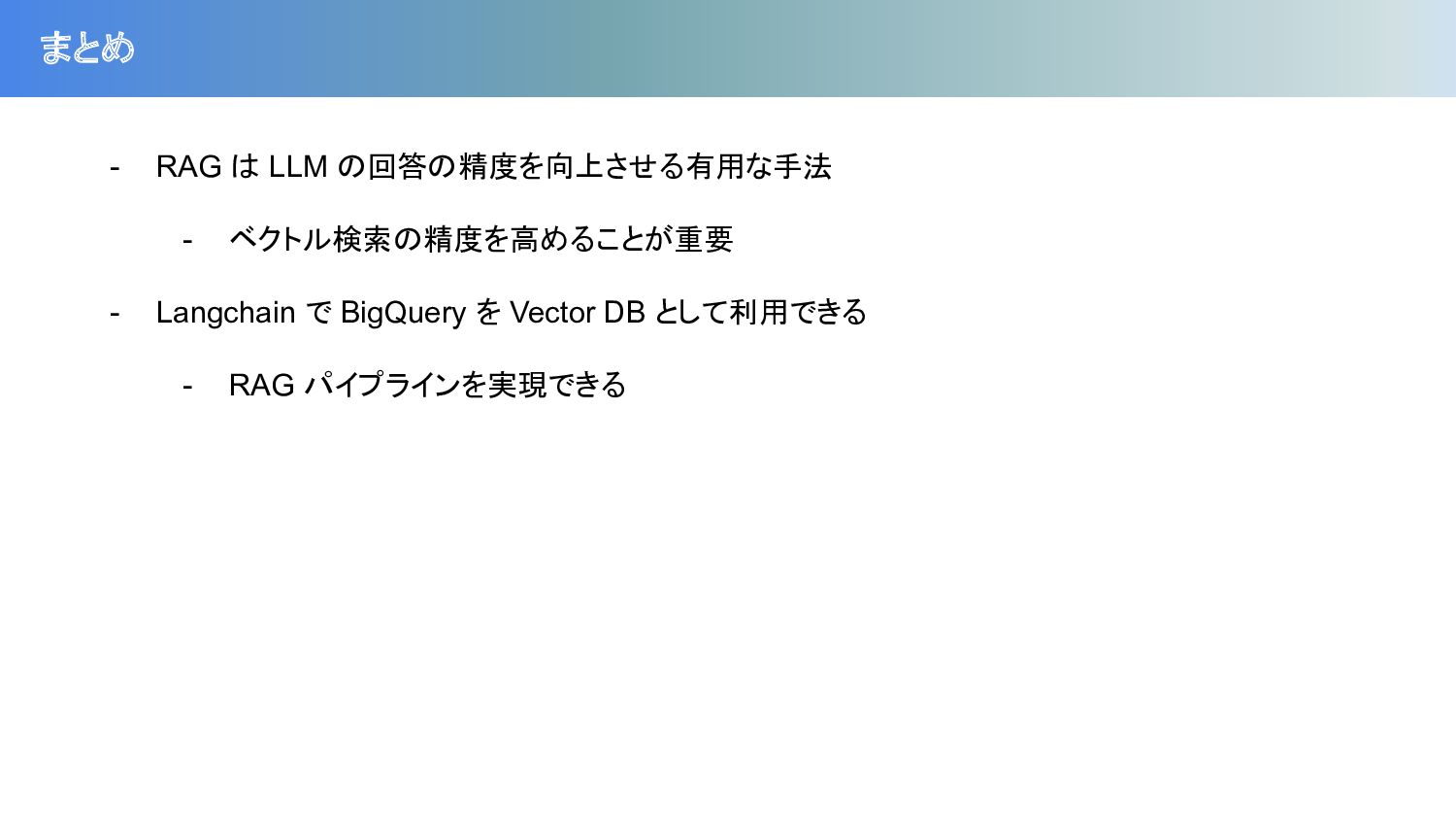 まとめ - RAG は LLM の回答の精度を向上させる有用な手法 - ベクトル検索の精度を高めることが重要 - Langchain