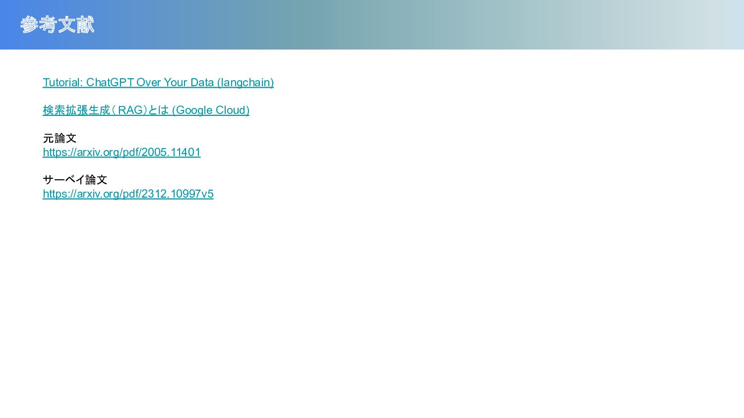 https://arxiv.org/pdf/2005.11401 サーベイ論文 https://arxiv.org/pdf/2312.10997v5 参考文献