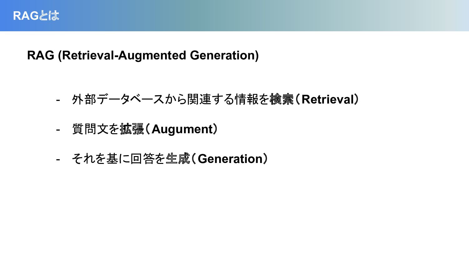 RAGとは RAG (Retrieval-Augmented Generation) - 外部データベースから関連する情報を検索(Retrieval) - 質問文を拡張(Augument) - それを基に回答を生成(Generation)