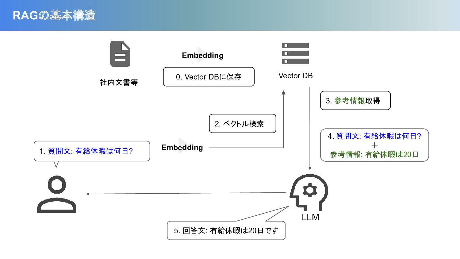+ 参考情報: 有給休暇は20日 1. 質問文: 有給休暇は何日? 5. 回答文: 有給休暇は20日です 0. Vector DBに保存 3. 参考情報取得 2. ベクトル検索