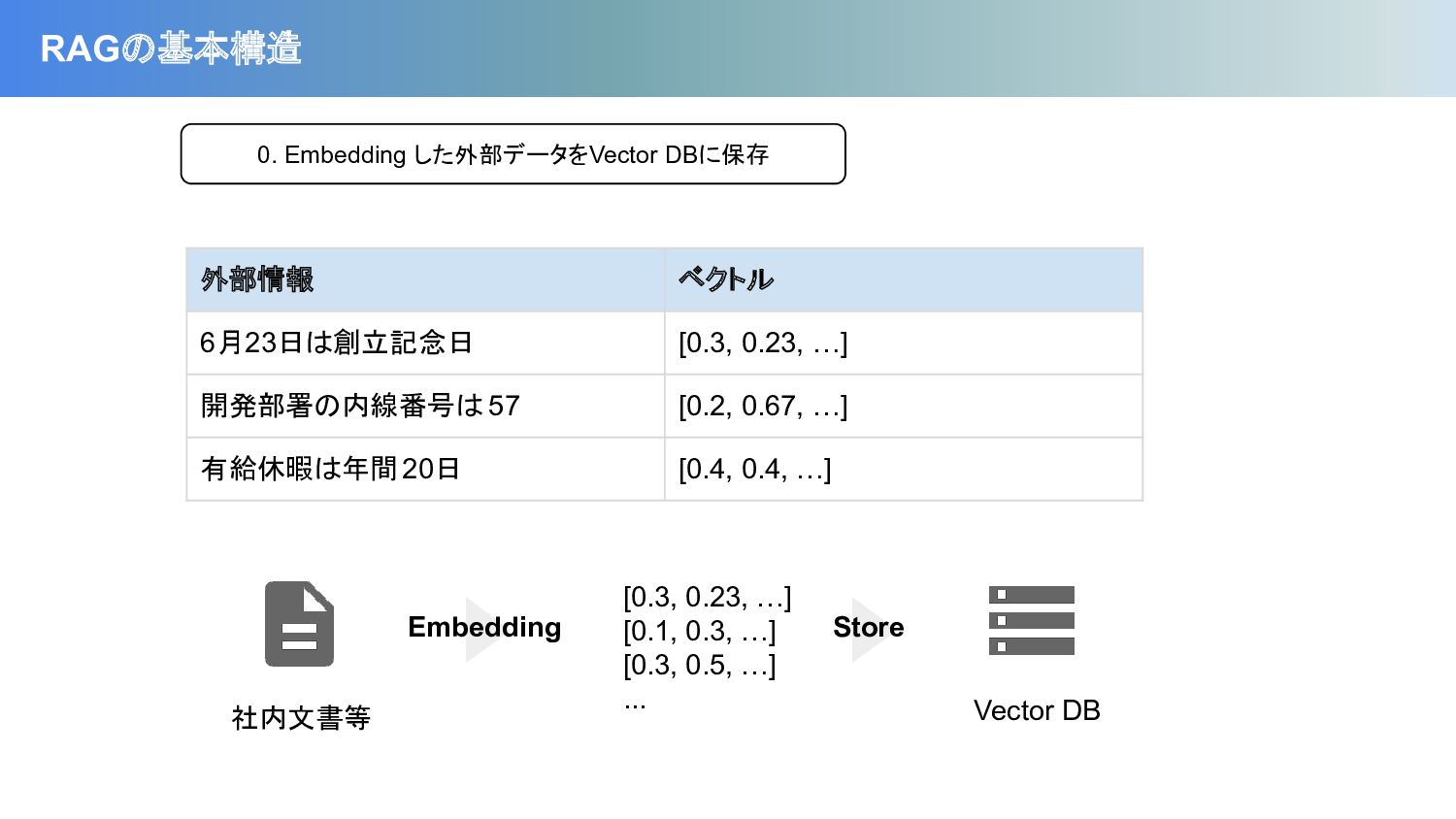 RAGの基本構造 外部情報 ベクトル 6月23日は創立記念日 [0.3, 0.23, …] 開発部署の内線番号は 57 [0.2,