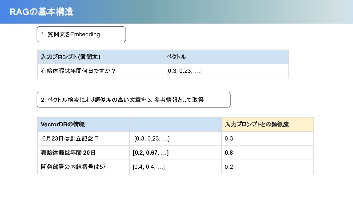 RAGの基本構造 入力プロンプト (質問文) ベクトル 有給休暇は年間何日ですか? [0.3, 0.23, …] VectorDBの情報 入力プロンプトとの類似度