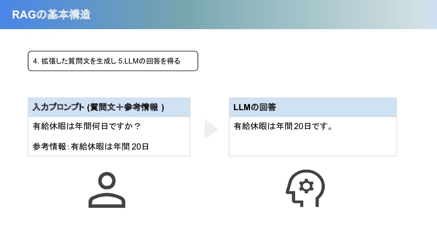 RAGの基本構造 入力プロンプト (質問文+参考情報 ) 有給休暇は年間何日ですか? 参考情報:有給休暇は年間 20日 LLMの回答 有給休暇は年間20日です。 4.