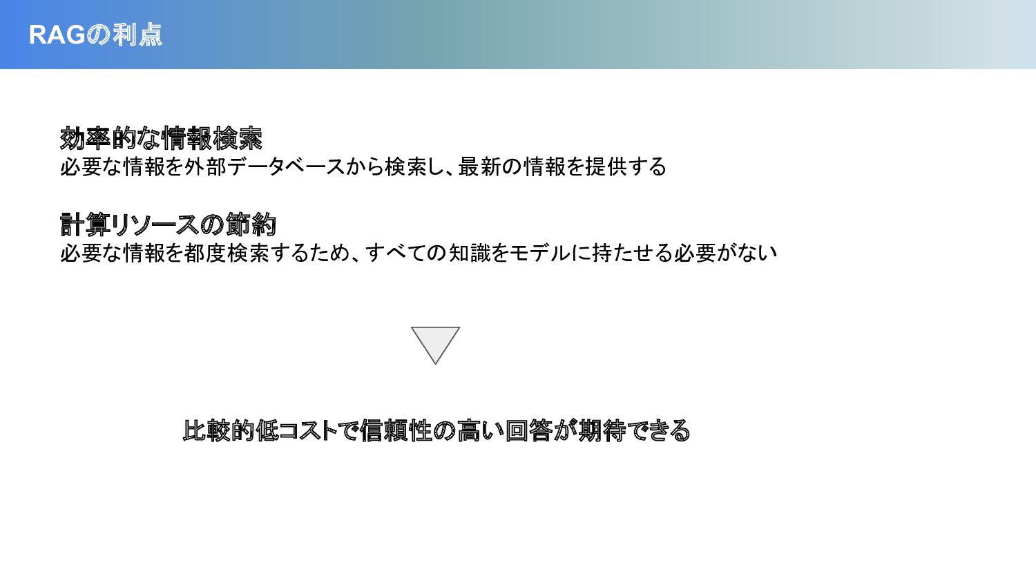 効率的な情報検索 必要な情報を外部データベースから検索し、最新の情報を提供する 計算リソースの節約 必要な情報を都度検索するため、すべての知識をモデルに持たせる必要がない RAGの利点 比較的低コストで信頼性の高い回答が期待できる