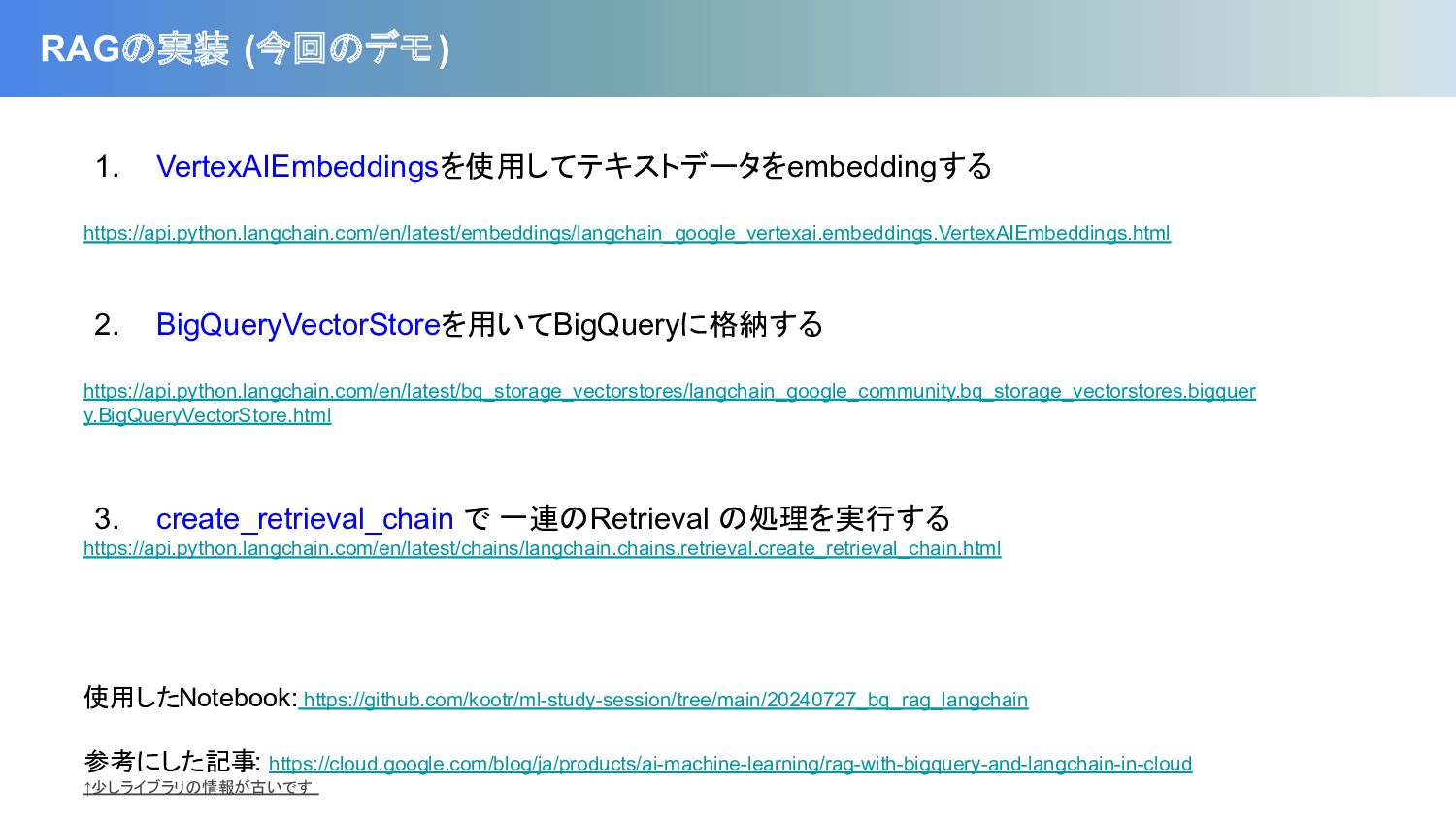 3. create_retrieval_chain で 一連のRetrieval の処理を実行する https://api.python.langchain.com/en/latest/chains/langchain.chains.retrieval.create_retrieval_chain.html 使用したNotebook: https://github.com/kootr/ml-study-session/tree/main/20240727_bq_rag_langchain 参考にした記事: https://cloud.google.com/blog/ja/products/ai-machine-learning/rag-with-bigquery-and-langchain-in-cloud ↑少しライブラリの情報が古いです