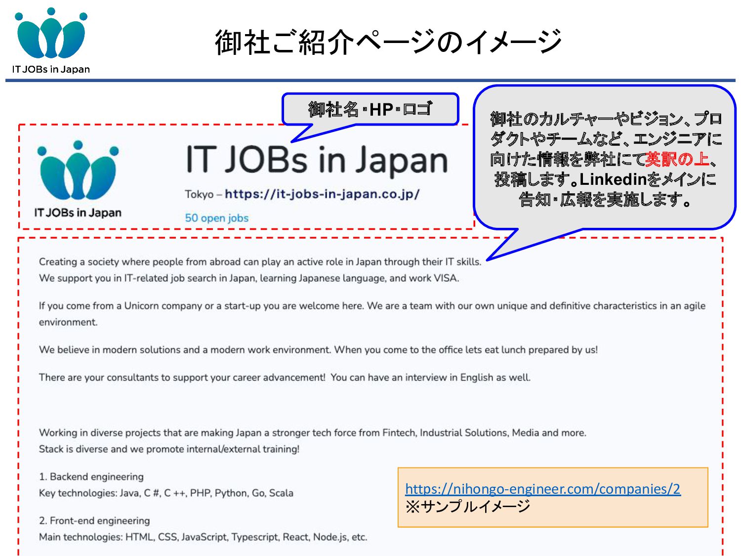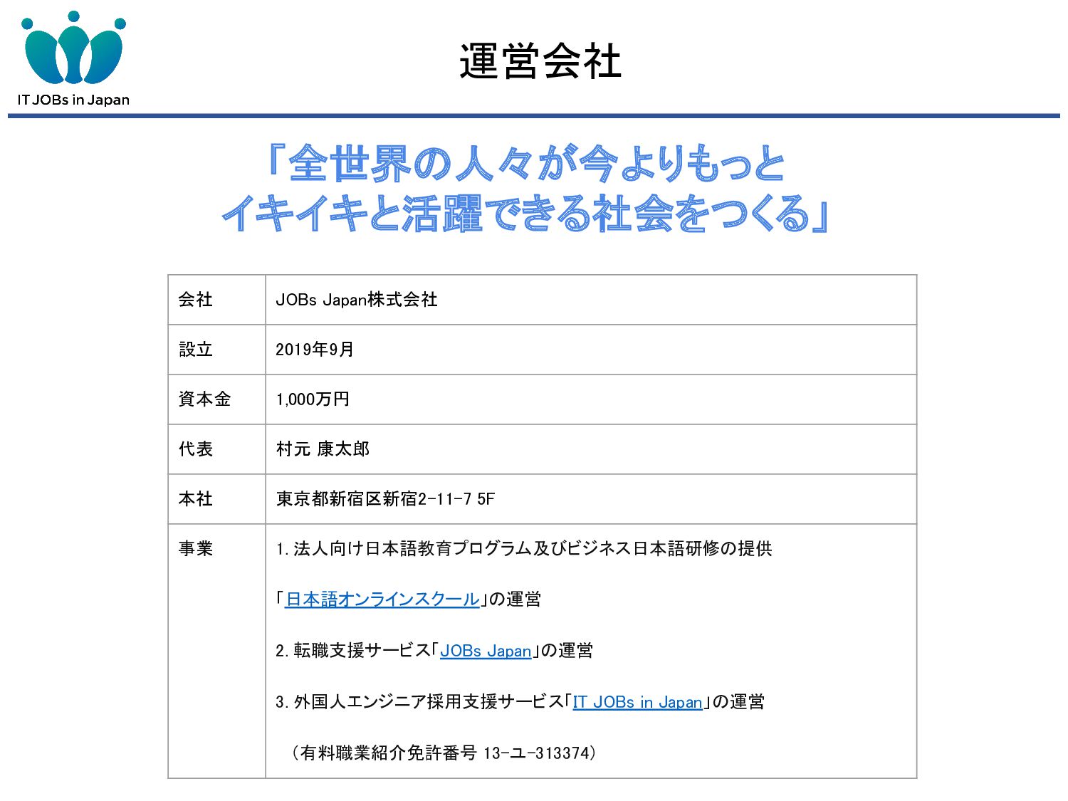 We are a company founded in 2019 with the mission of "Creating a society where people from abroad can play an active role in Japan through their IT skills, regardless of birth, nationality, or age.”