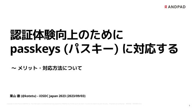 iOSDC Japan 2023 の トーク「認証体験向上のためにpasskeys(パスキー)に対応する 〜 メリット・対応方法について」の発表資料です。