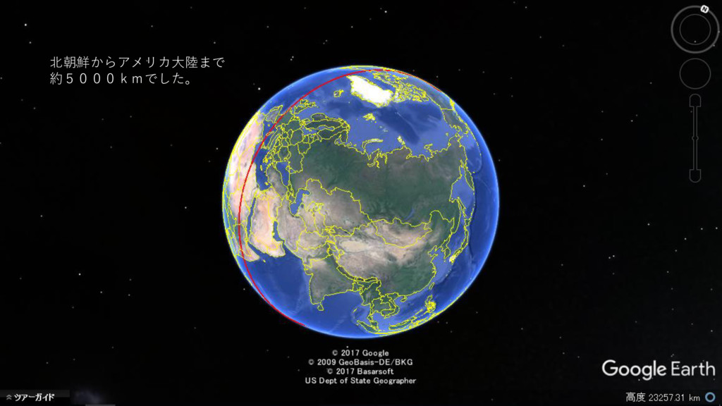 北朝鮮からアメリカ大陸まで 約5000kmでした。 北朝鮮からアメリカ大陸まで 約5000kmでした。