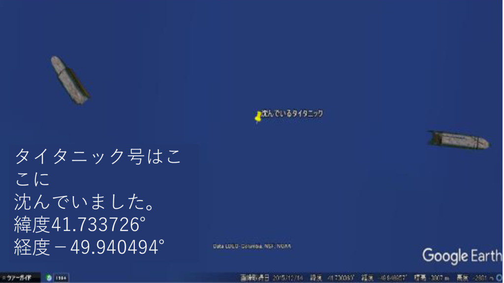 タイタニック号はこ こに 沈んでいました。 緯度41.733726° 経度-49.940494°