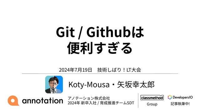 Group 記事執筆中! アノテーション株式会社 2024年 新卒⼊社 / 育成推進チームSDT Koty-Mousa‧⽮坂幸太郎 Git /