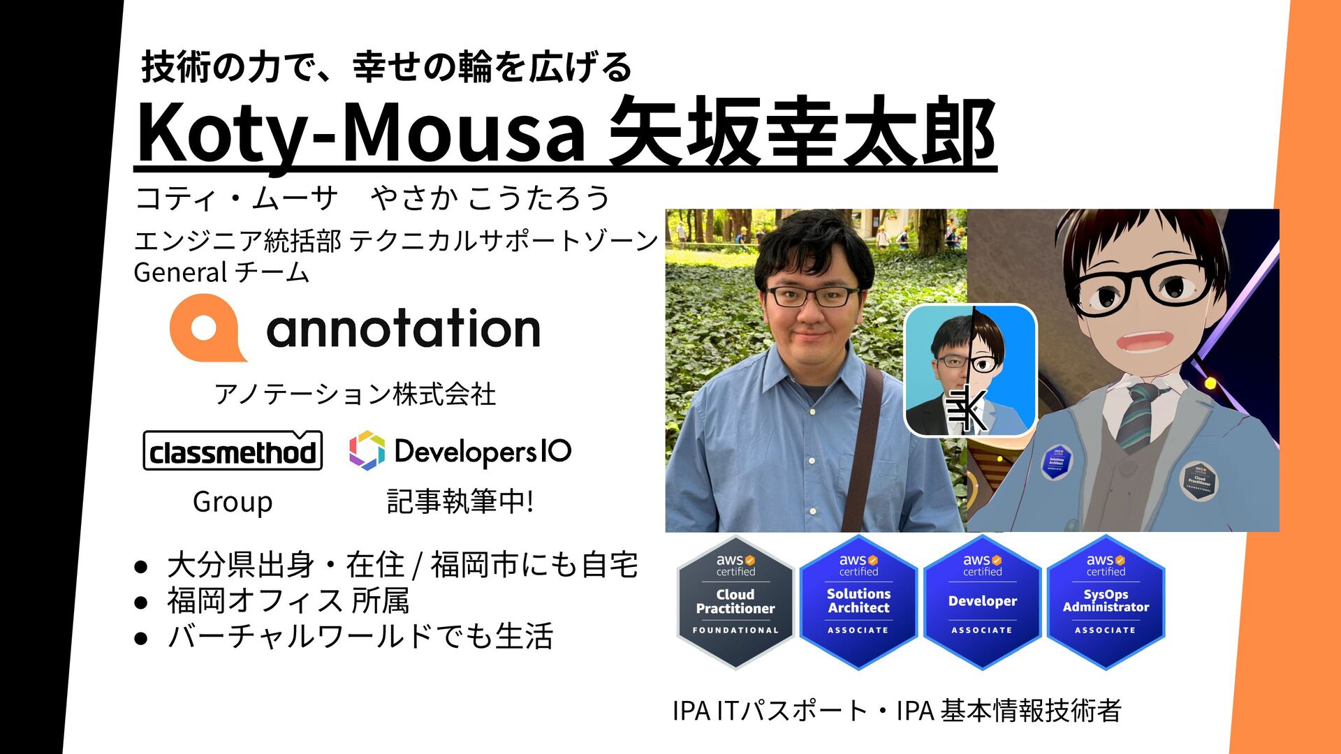 バーチャルワールドでも⽣活 アノテーション株式会社 コティ‧ムーサ やさか こうたろう Group 記事執筆中! エンジニア統括部 テクニカルサポートゾーン General チーム IPA ITパスポート‧IPA 基本情報技術者 技術の⼒で、幸せの輪を広げる