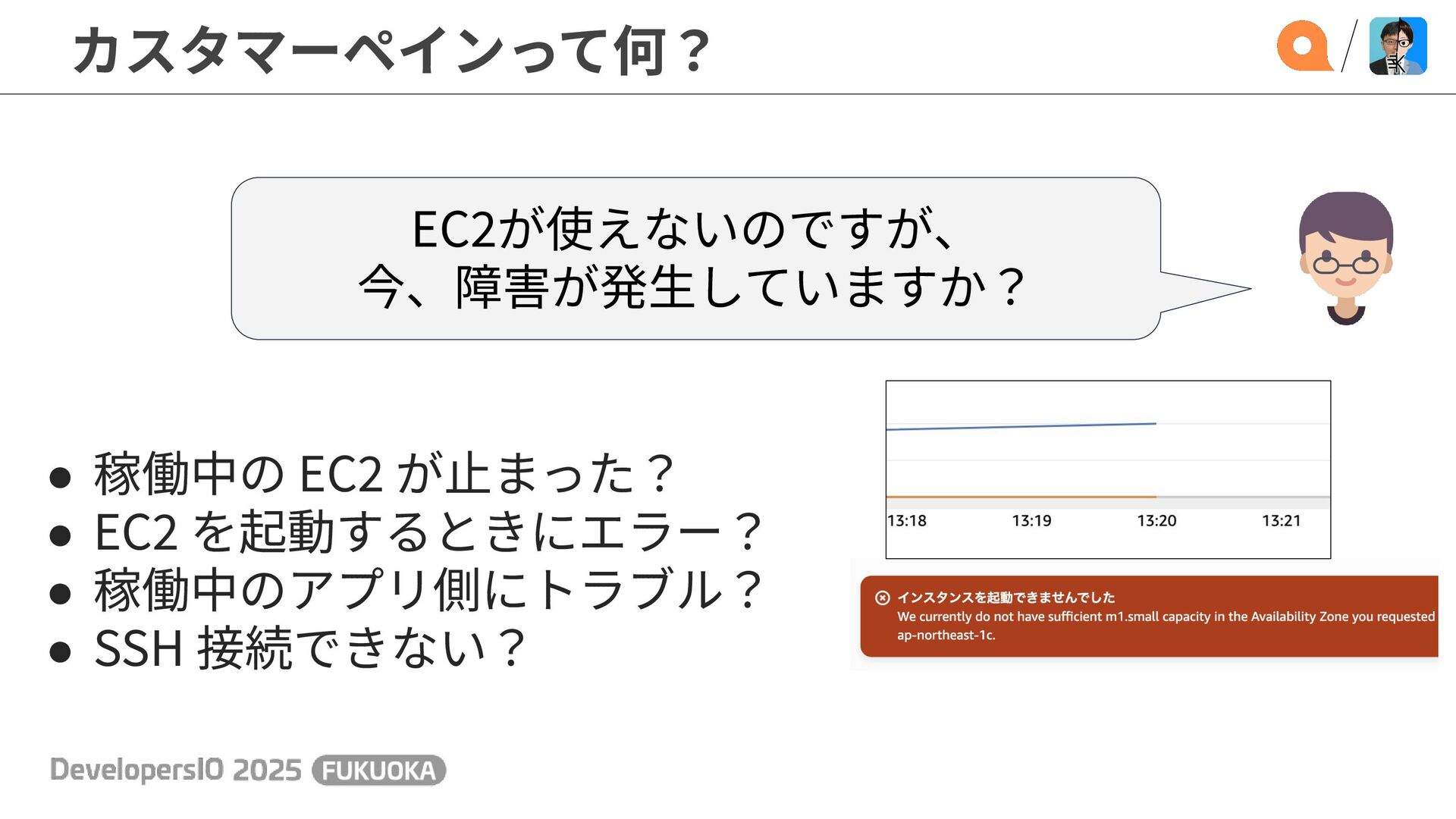 カスタマーペインって何? EC2が使えないのですが、 今、障害が発⽣していますか? • 稼働中の EC2 が⽌まった? • EC2 を起動するときにエラー?