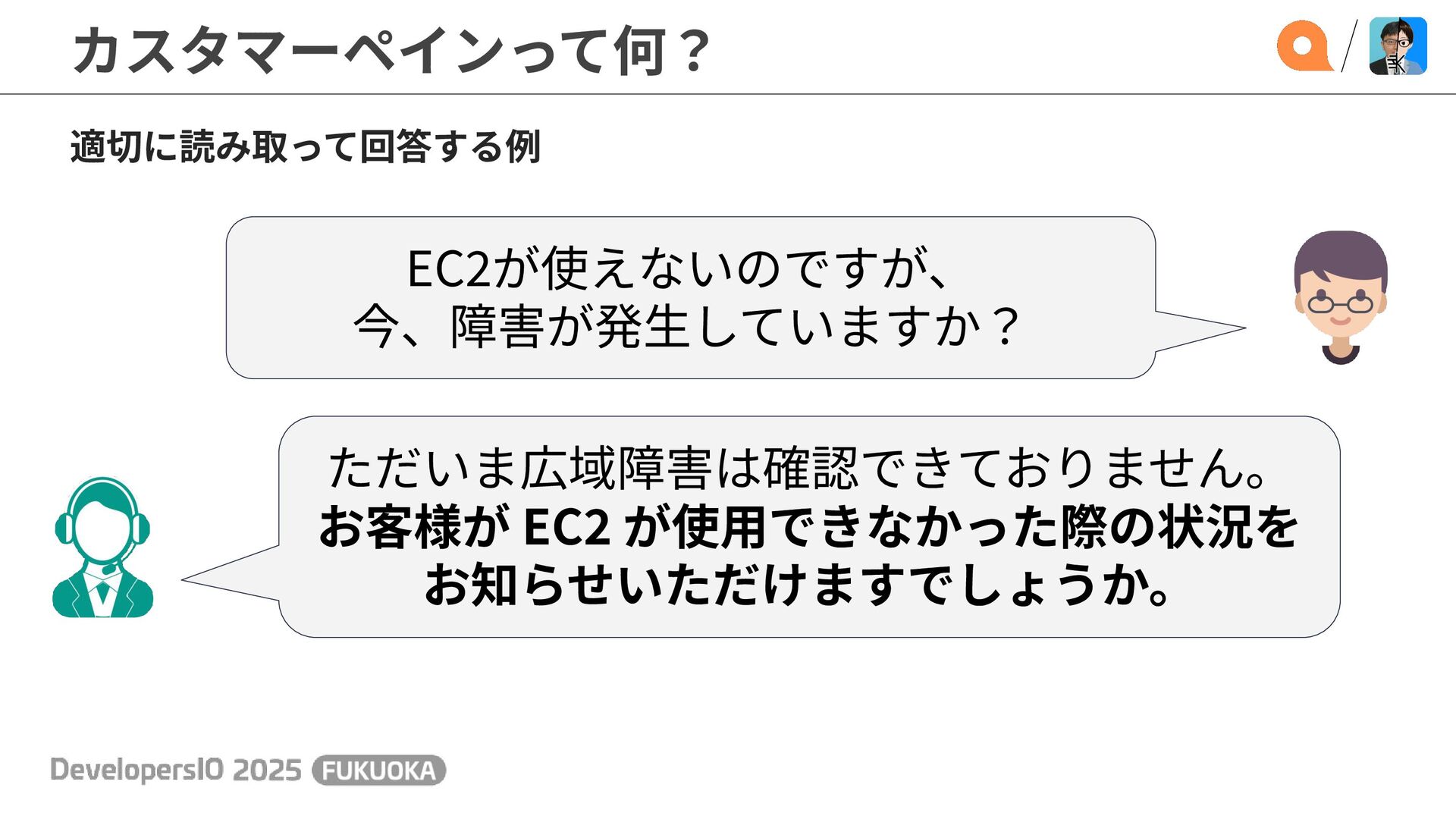 カスタマーペインって何? EC2が使えないのですが、 今、障害が発⽣していますか? 適切に読み取って回答する例 ただいま広域障害は確認できておりません。 お客様が EC2 が使⽤できなかった際の状況を お知らせいただけますでしょうか。