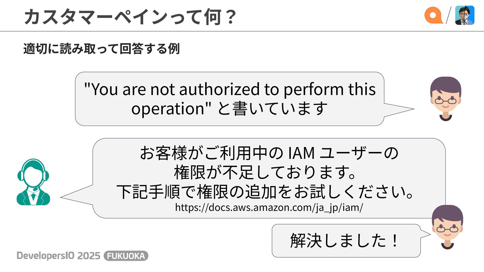 適切に読み取って回答する例 お客様がご利⽤中の IAM ユーザーの 権限が不⾜しております。 下記⼿順で権限の追加をお試しください。 https://docs.aws.amazon.com/ja_jp/iam/ 解決しました!