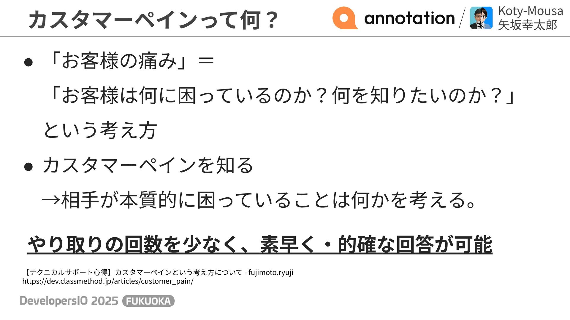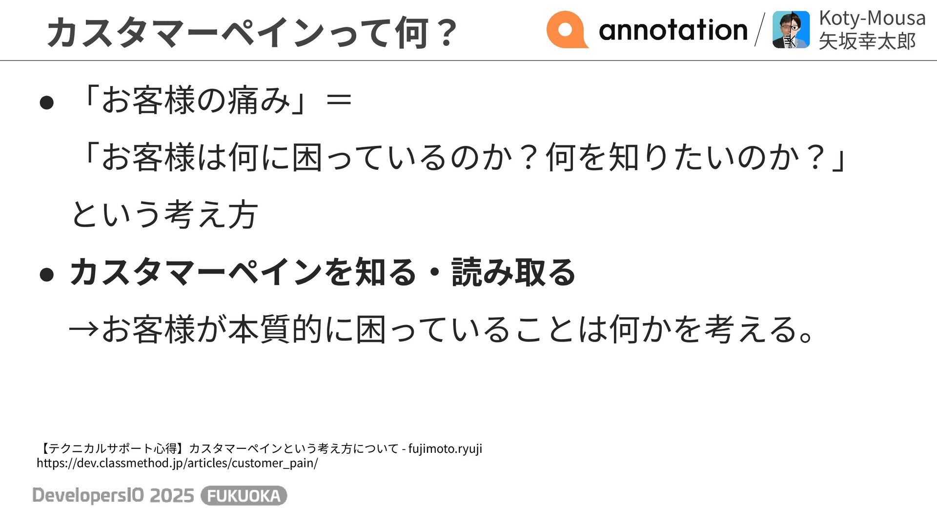 カスタマーペインって何? 【テクニカルサポート⼼得】カスタマーペインという考え⽅について - fujimoto.ryuji https://dev.classmethod.jp/articles/customer_pain/