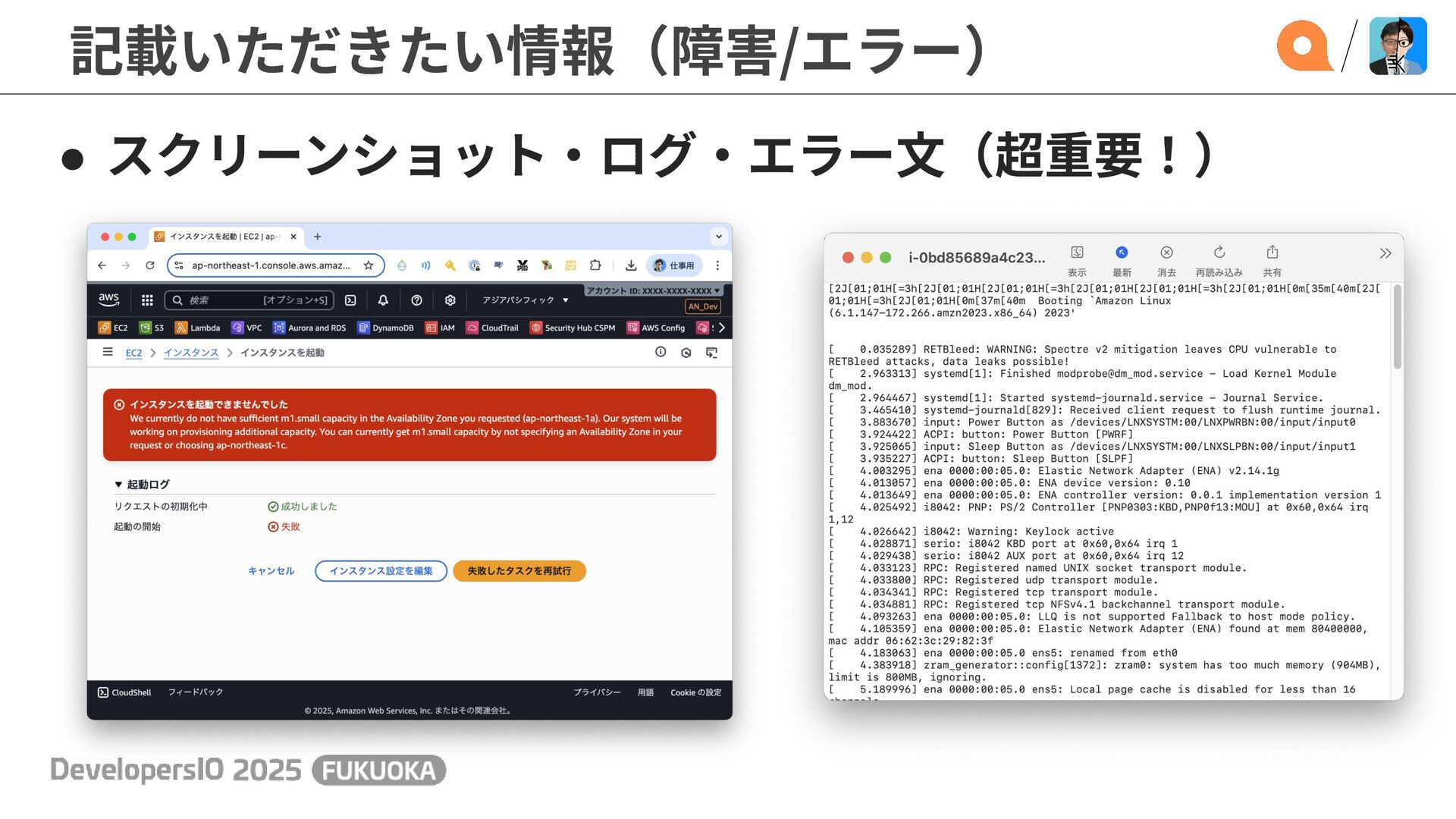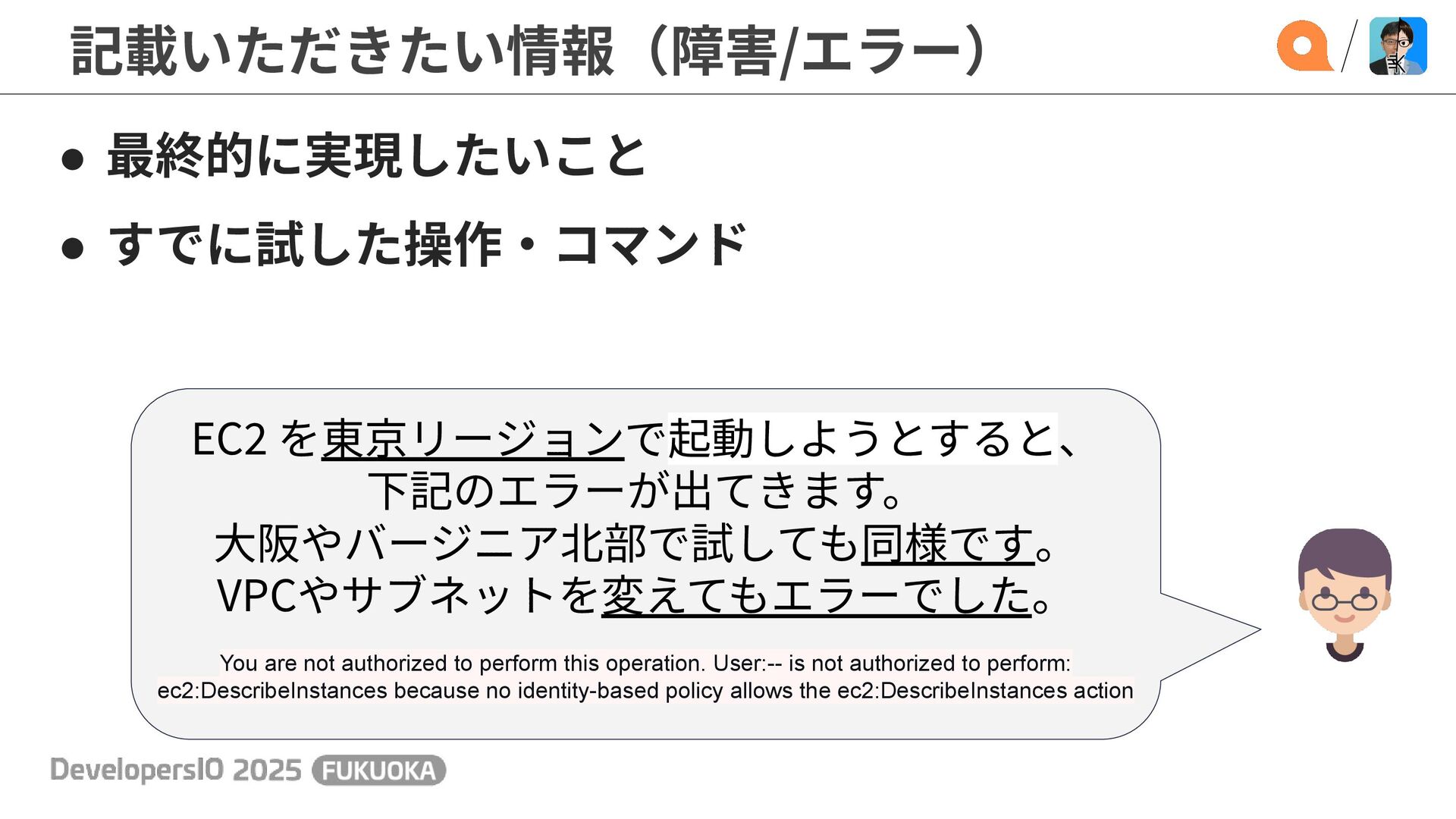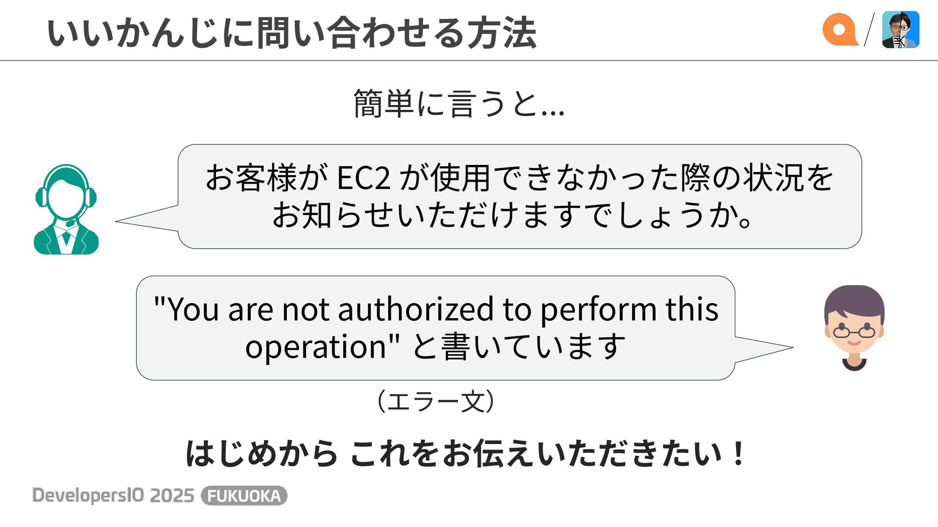 簡単に⾔うと... はじめから これをお伝えいただきたい! (エラー⽂) お客様が EC2 が使⽤できなかった際の状況を お知らせいただけますでしょうか。
