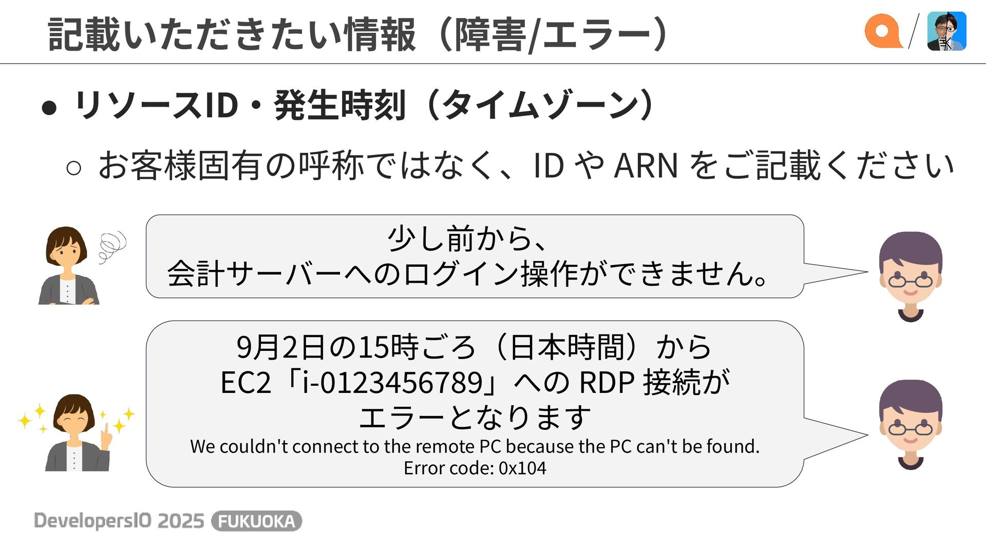 記載いただきたい情報(障害/エラー) • リソースID‧発⽣時刻(タイムゾーン) ◦ お客様固有の呼称ではなく、ID や ARN をご記載ください 少し前から、 会計サーバーへのログイン操作ができません。