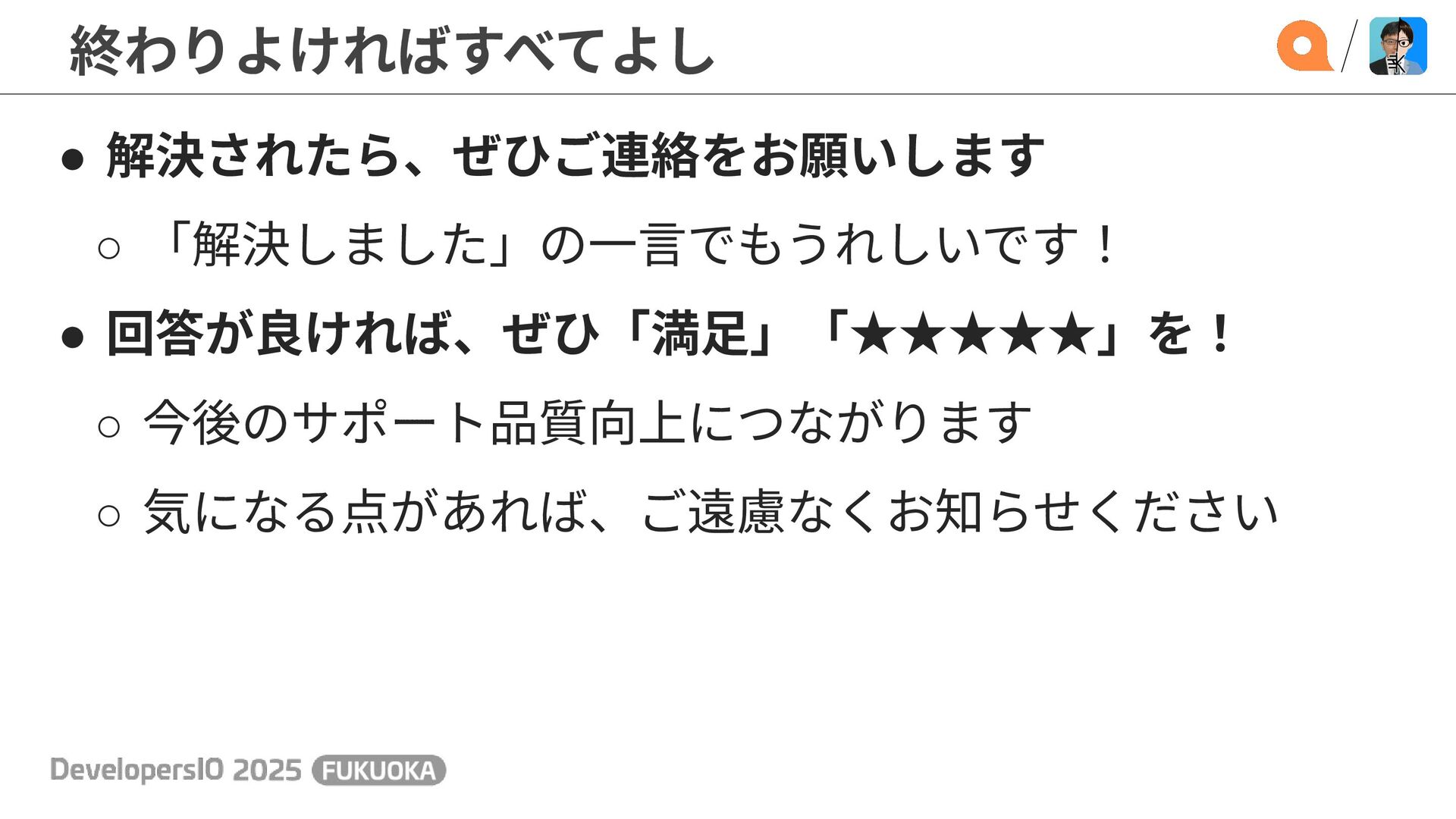 終わりよければすべてよし • 解決されたら、ぜひご連絡をお願いします ◦ 「解決しました」の⼀⾔でもうれしいです! • 回答が良ければ、ぜひ「満⾜」「★★★★★」を! ◦ 今後のサポート品質向上につながります ◦