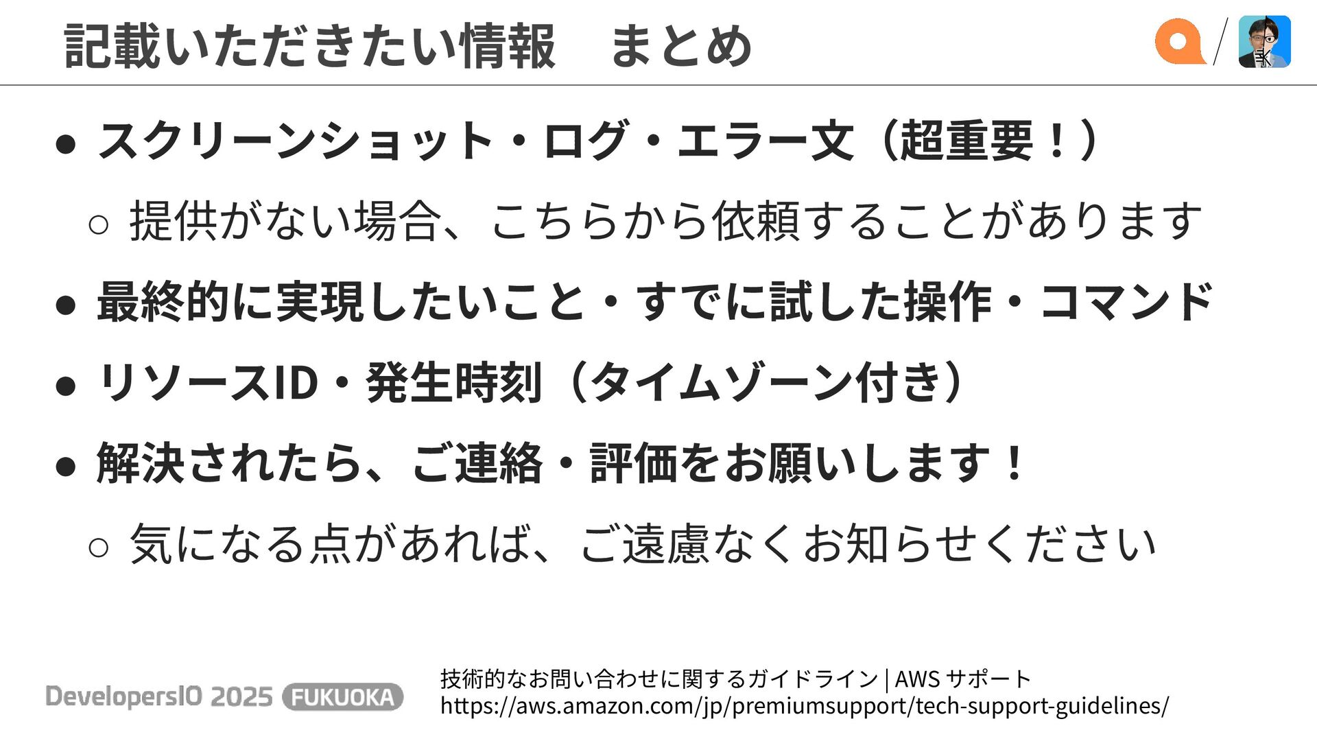 記載いただきたい情報 まとめ 技術的なお問い合わせに関するガイドライン | AWS サポート https://aws.amazon.com/jp/premiumsupport/tech-support-guidelines/ • スクリーンショット‧ログ‧エラー⽂(超重要!) ◦ 提供がない場合、こちらから依頼することがあります