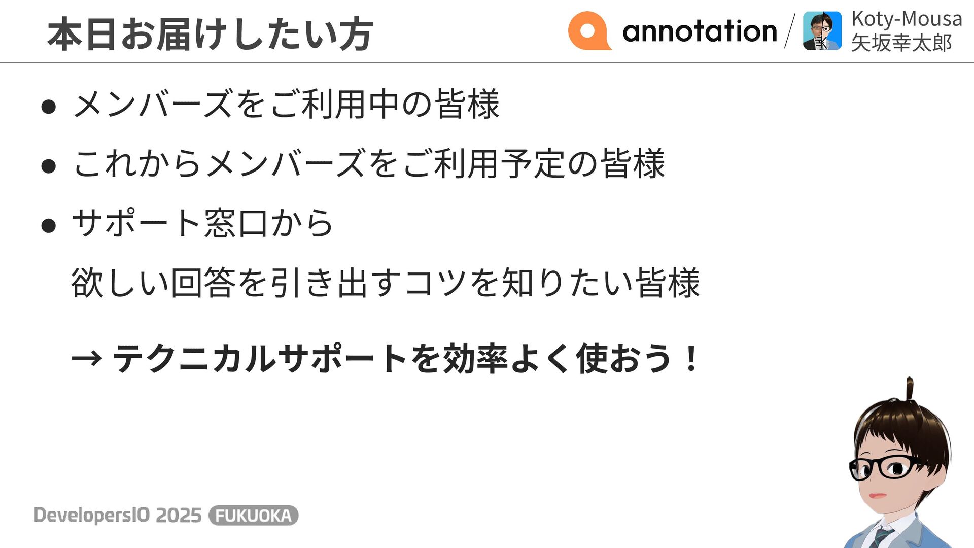 Koty-Mousa ⽮坂幸太郎 • メンバーズをご利⽤中の皆様 • これからメンバーズをご利⽤予定の皆様 • サポート窓⼝から 欲しい回答を引き出すコツを知りたい皆様 →