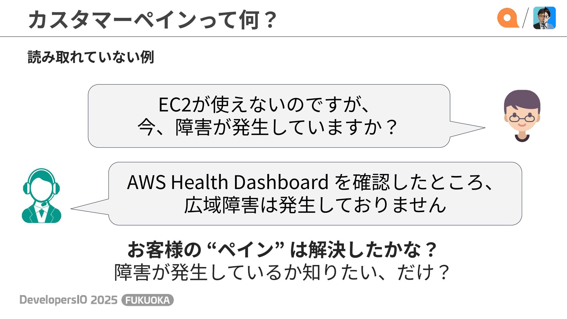 カスタマーペインって何? EC2が使えないのですが、 今、障害が発⽣していますか? AWS Health Dashboard を確認したところ、 広域障害は発⽣しておりません 読み取れていない例 お客様の