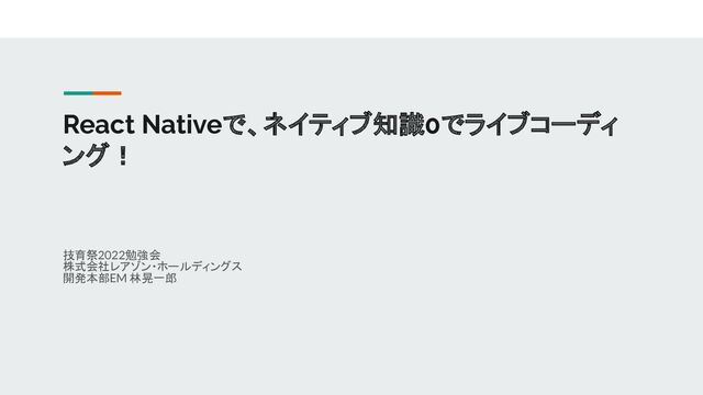 React Nativeで、ネイティブ知識0でライブコーディ ング! 技育祭2022勉強会 株式会社レアゾン・ホールディングス 開発本部EM 林晃一郎