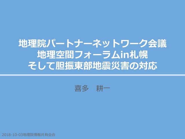 2018-10-03地理院情報共有会合 地理院パートナーネットワーク会議 地理空間フォーラムin札幌 そして胆振東部地震災害の対応 喜多 耕一