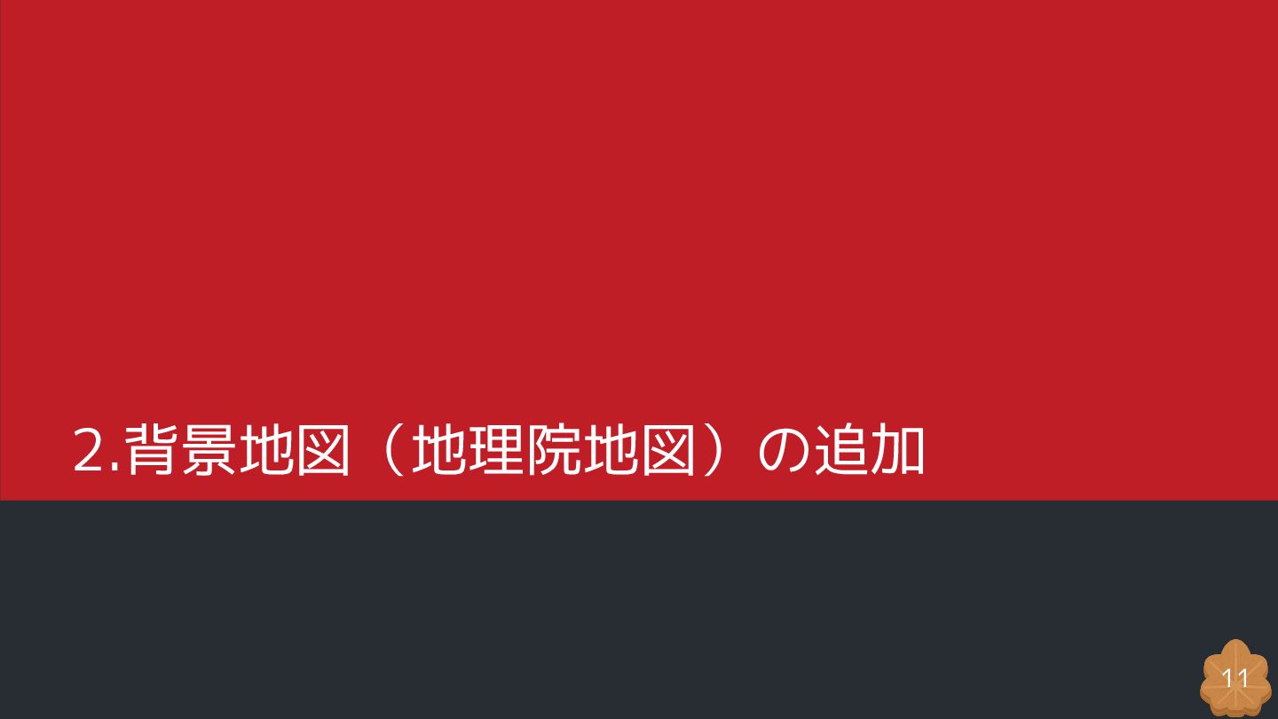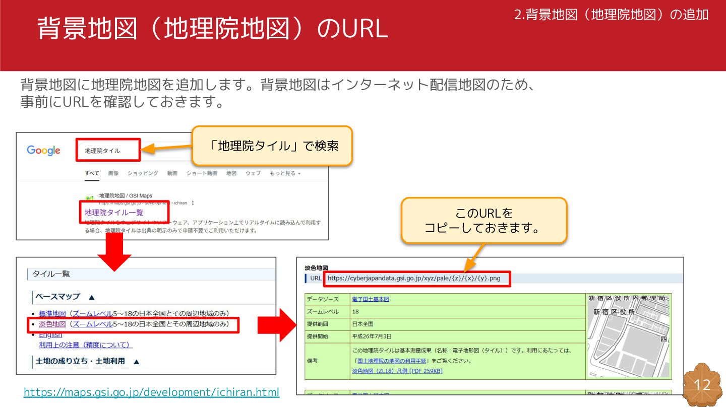 背景地図(地理院地図)のURL 12 背景地図に地理院地図を追加します。背景地図はインターネット配信地図のため、 事前にURLを確認しておきます。 「地理院タイル」で検索 このURLを コピーしておきます。 2.背景地図(地理院地図)の追加 https://maps.gsi.go.jp/development/ichiran.html