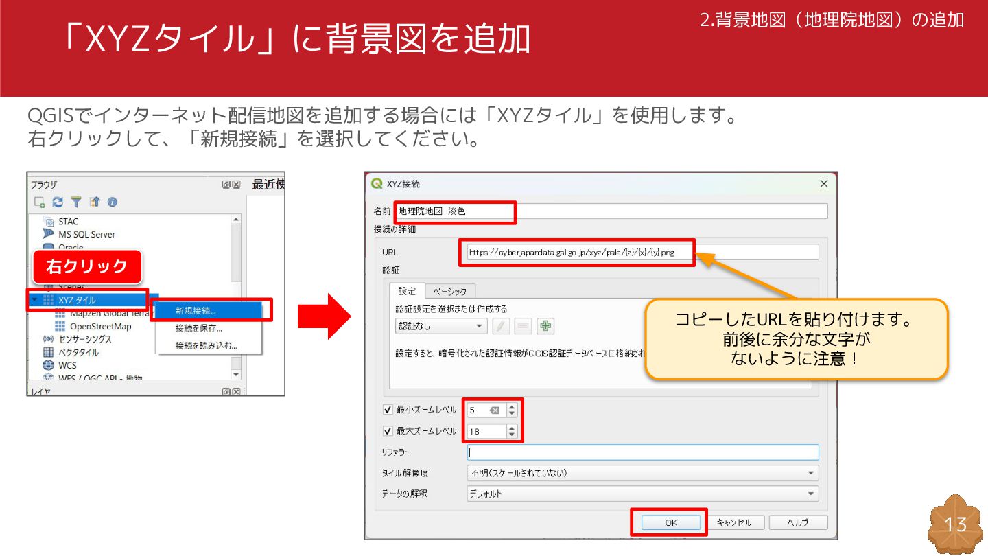 「XYZタイル」に背景図を追加 13 QGISでインターネット配信地図を追加する場合には「XYZタイル」を使用します。 右クリックして、「新規接続」を選択してください。 右クリック コピーしたURLを貼り付けます。 前後に余分な文字が ないように注意! 2.背景地図(地理院地図)の追加