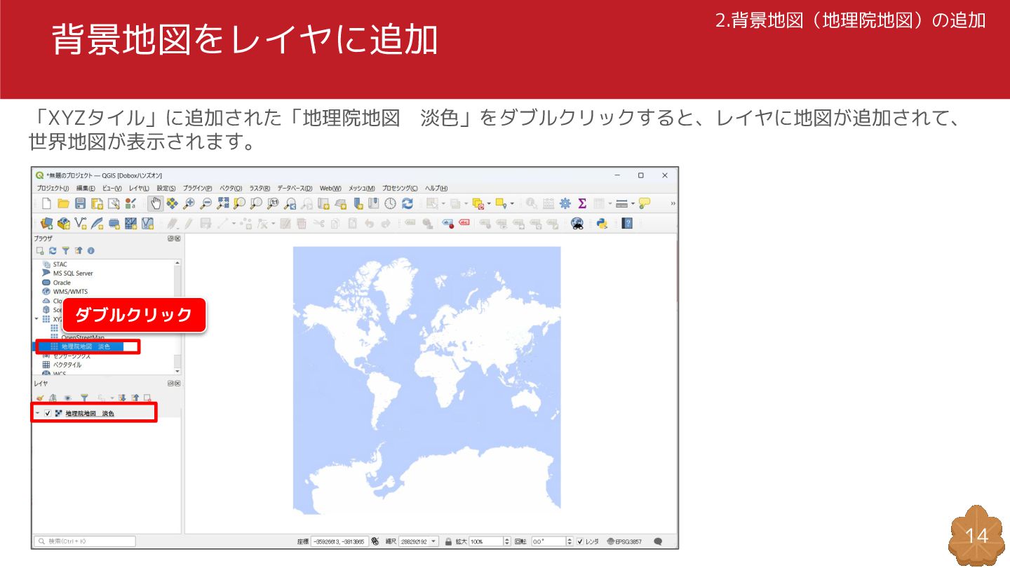 背景地図をレイヤに追加 14 「XYZタイル」に追加された「地理院地図 淡色」をダブルクリックすると、レイヤに地図が追加されて、 世界地図が表示されます。 ダブルクリック 2.背景地図(地理院地図)の追加