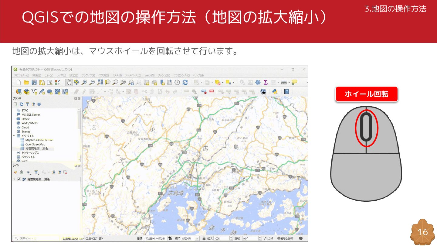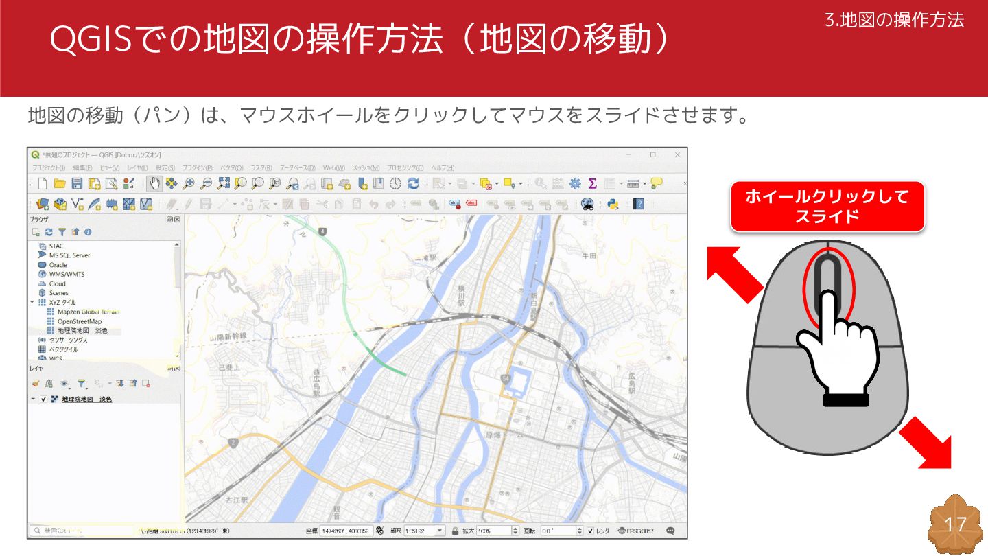 QGISでの地図の操作方法(地図の拡大縮小) 16 地図の拡大縮小は、マウスホイールを回転させて行います。 ホイール回転 3.地図の操作方法