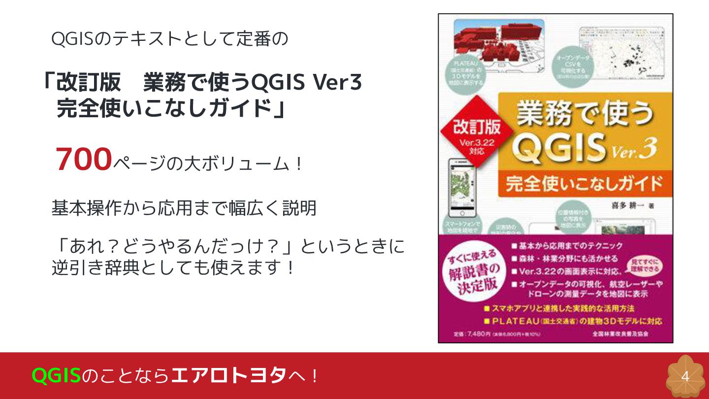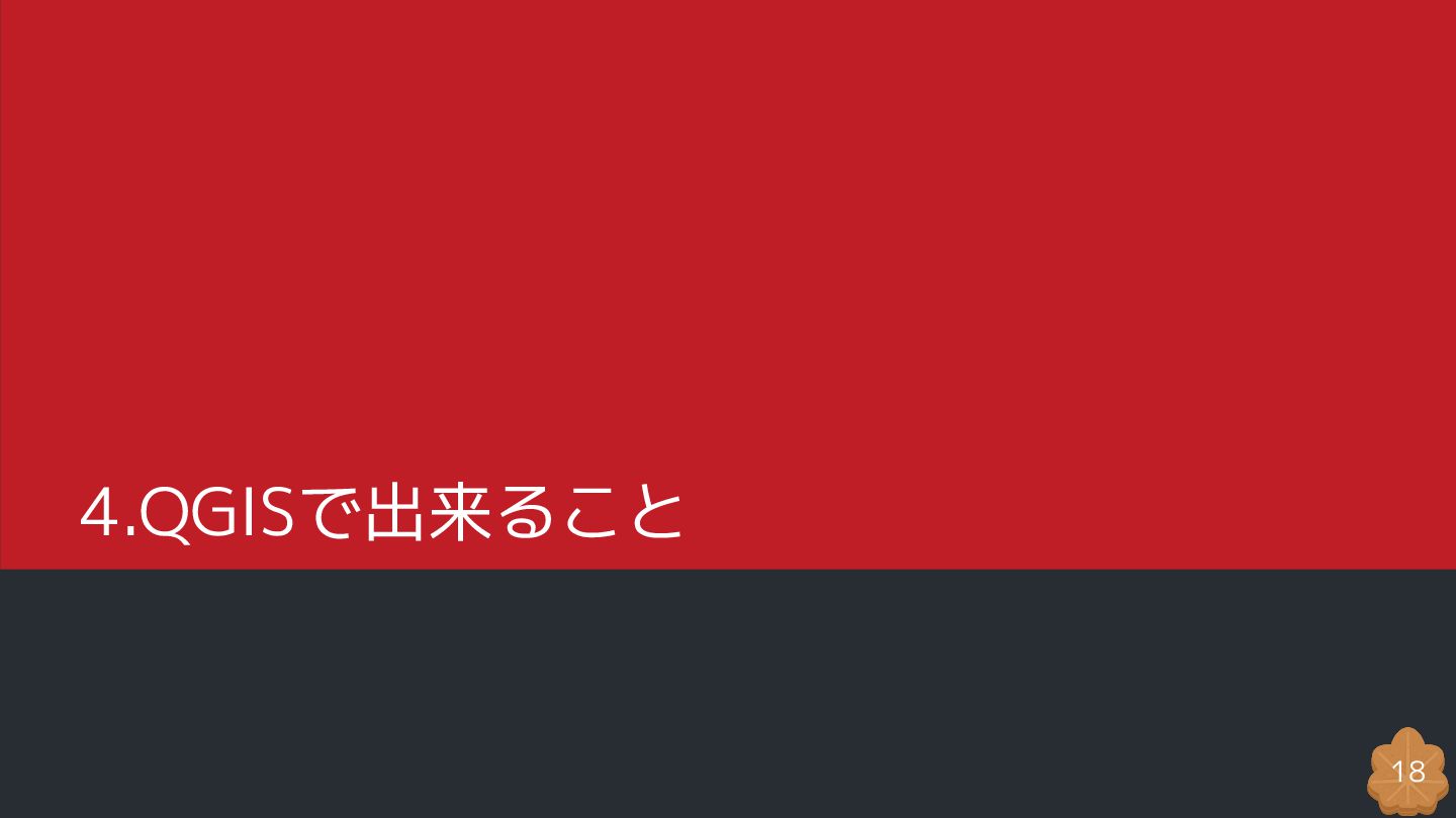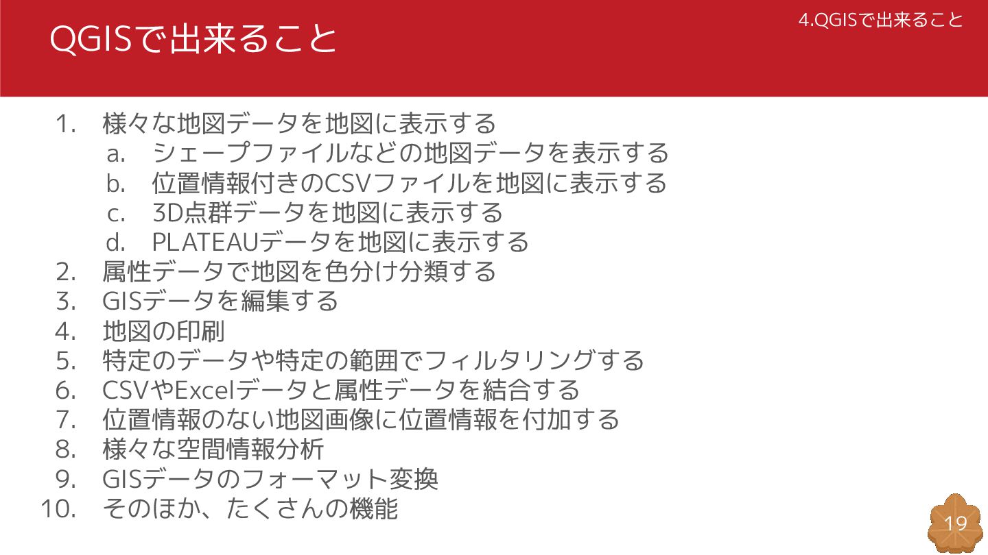 d. PLATEAUデータを地図に表示する 2. 属性データで地図を色分け分類する 3. GISデータを編集する 4. 地図の印刷 5. 特定のデータや特定の範囲でフィルタリングする 6. CSVやExcelデータと属性データを結合する 7. 位置情報のない地図画像に位置情報を付加する 8. 様々な空間情報分析 9. GISデータのフォーマット変換 10. そのほか、たくさんの機能 4.QGISで出来ること